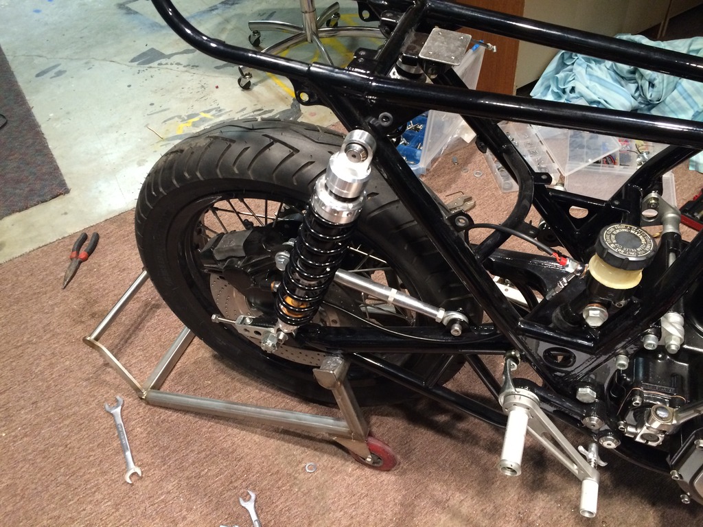 I finally have some time to work on the bike and started assembling a couple more things. Very pleased with how the rear sets worked out, but I need to modify the kick for more clearance, and perhaps get some folding footpegs. which are a good safety feature as well for a street bike. My buddy also gave me this sweet stainless stand he welded up years ago for his track bike.