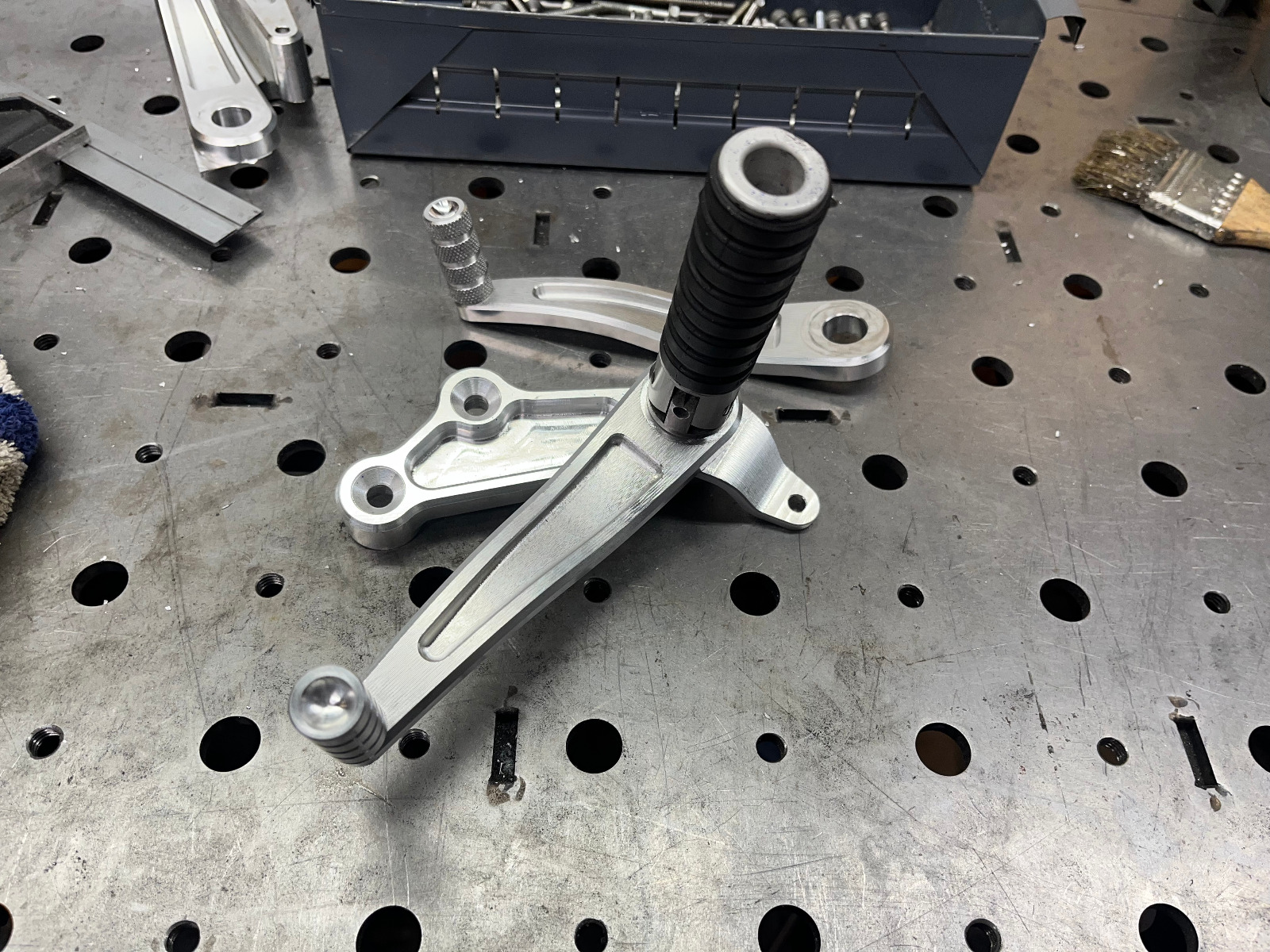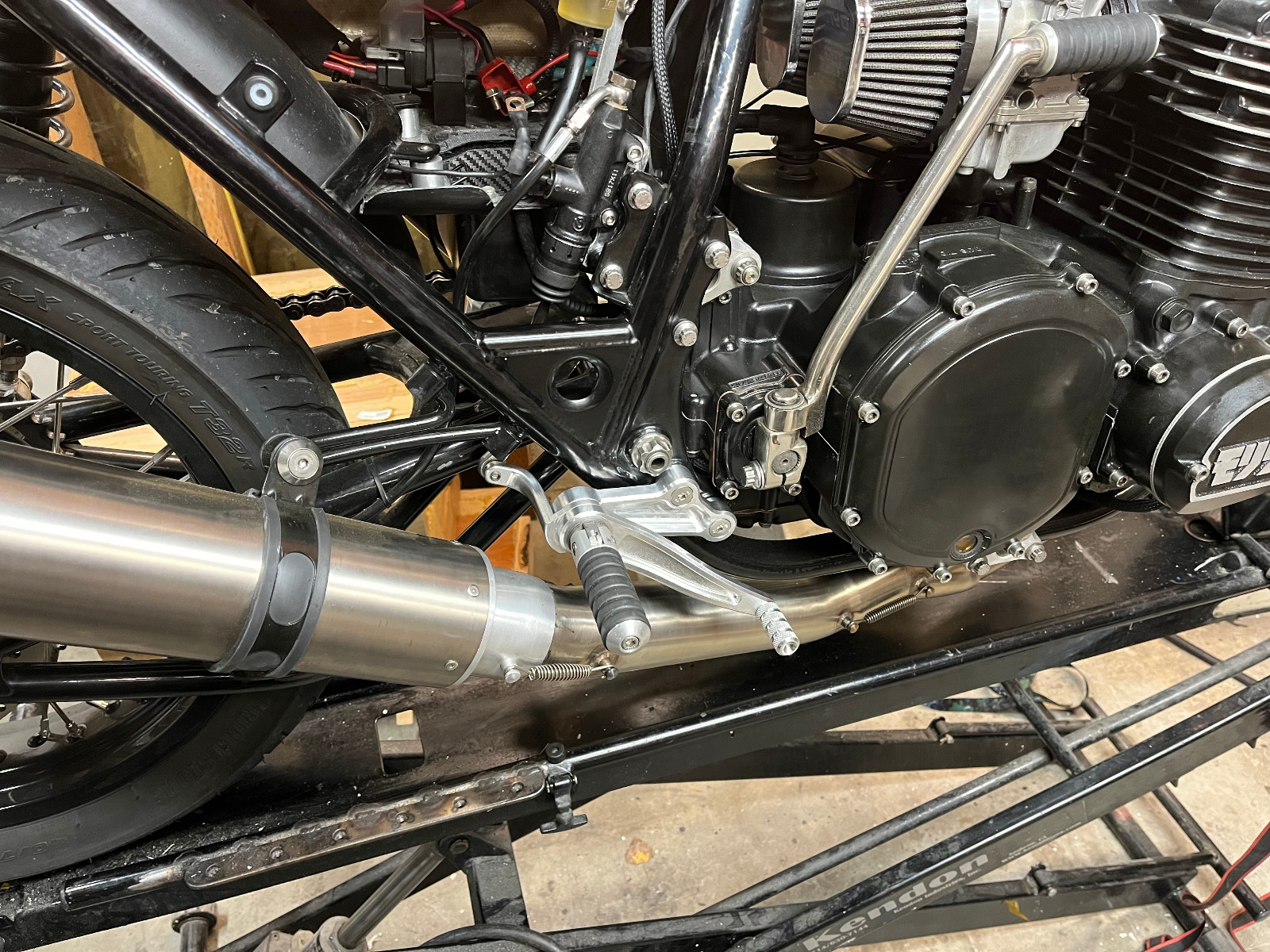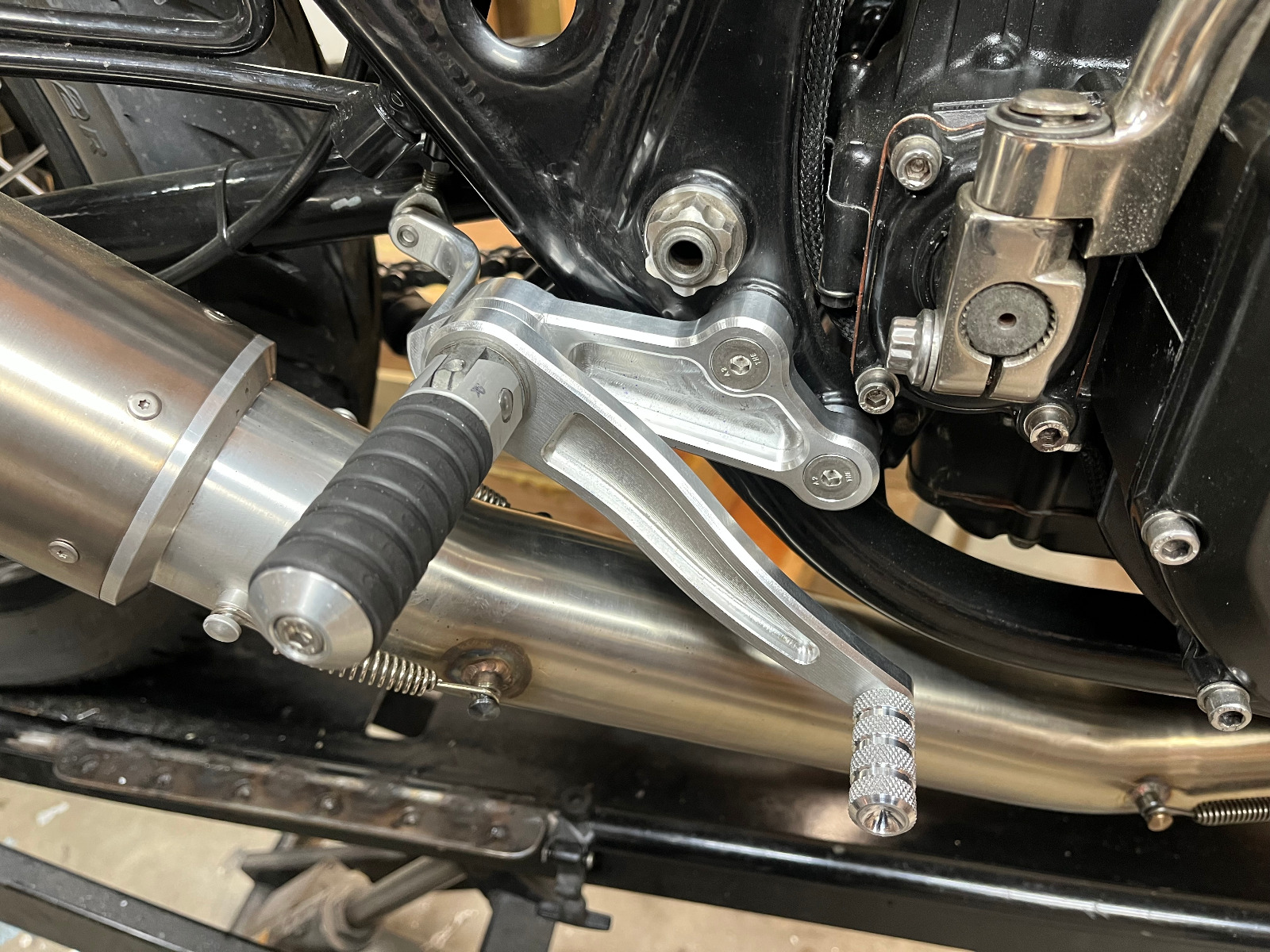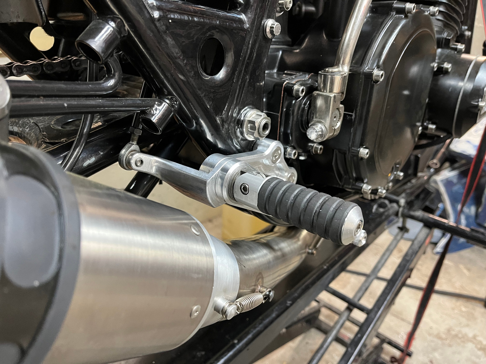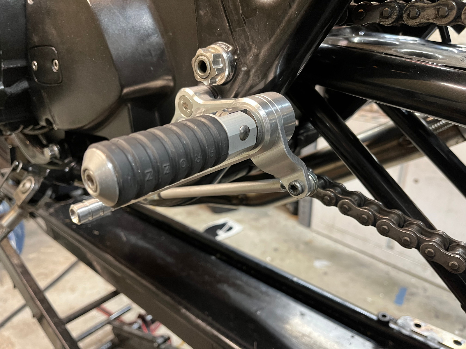 I was never totally happy with the Tarozzi rear sets on this bike. The peg location was too high, too far back, and too wide for my liking. The levers were too short for my size 13 feet and the angle of them meant I occasionally pushed them unintentionally with the side of my foot dragging the rear brake. On top of that I didn't like how chunky they looked. Pretty much the only things I like about them were the mechanism to keep the kick-start I developed and the rubber on the pegs.