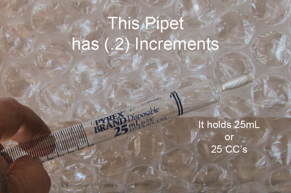 I choose the Pipet over the Buret tube. The Buret tube looks really cool, and is fun to play with. They cost about $140...You use it once, then spend the next 50 years protecting it, so it doesn't get broke. Pipettes come in glass or plastic, the price range varies. A pipet can cost from $3.00 - $ 3,000.00. The smaller the increments, the higher the price. I am using a 2/10's increment Pipet. It never hurts to have an extra, oops! I dropped it!
