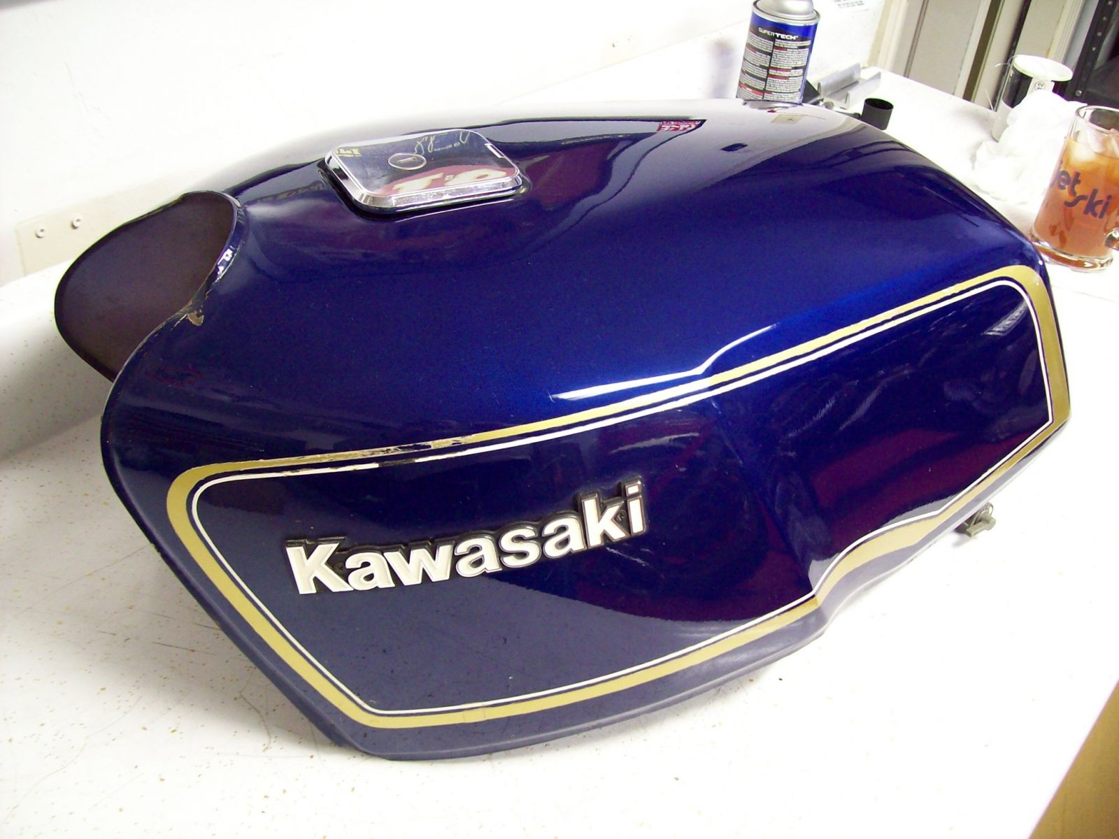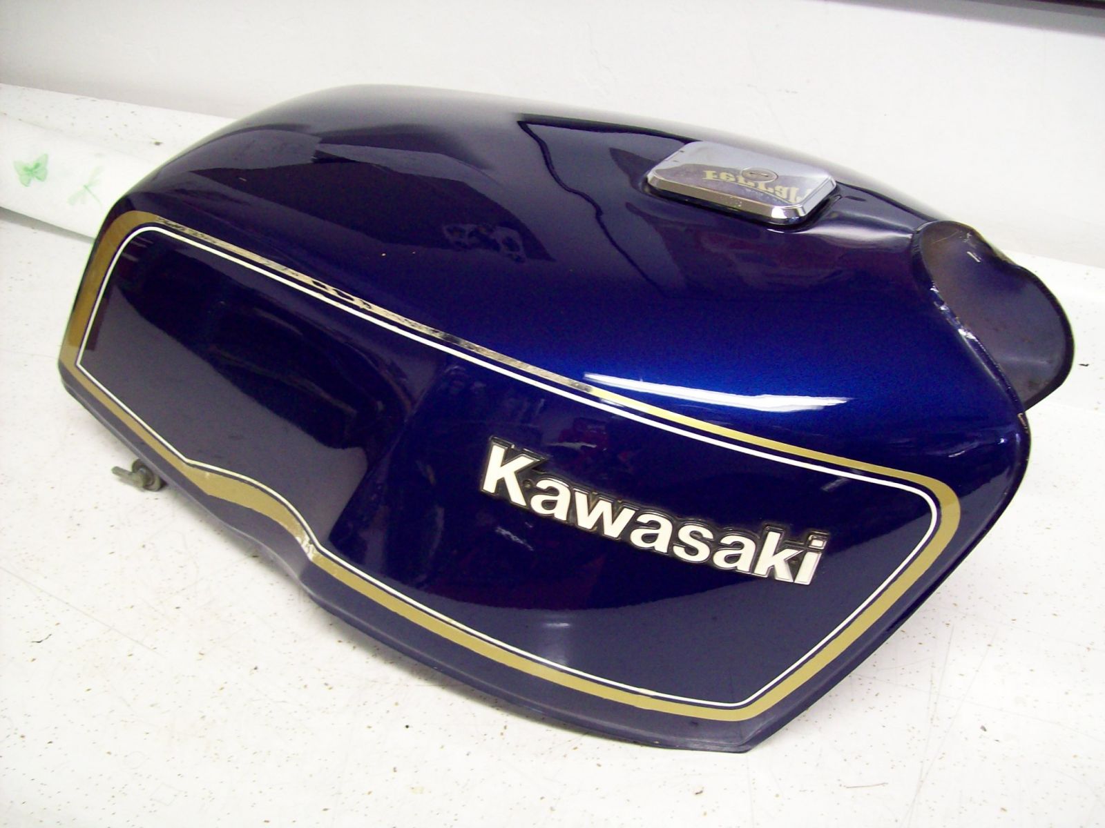 I have decided to use my 1979 Luminous Navy Blue Metallic body work on my KZ1000 instead of the '80 black body work. The problem is back in the mid 80's, I got a hold of some of that fancy Elf Formula 1 gas that the Williams team was using for my Superbike. It was some strange smelling "gasoline". I spilled some on my fuel tank, and before I could get a rag to wipe off the tank, it ate through the clear coat on my fuel tank and actually soften up the pin stripping on the tank!!!! Plus that "gasoline" made my eyes water worse than nitro fumes ever did.