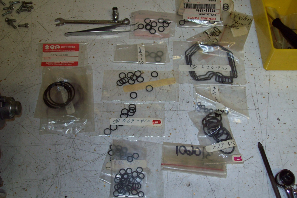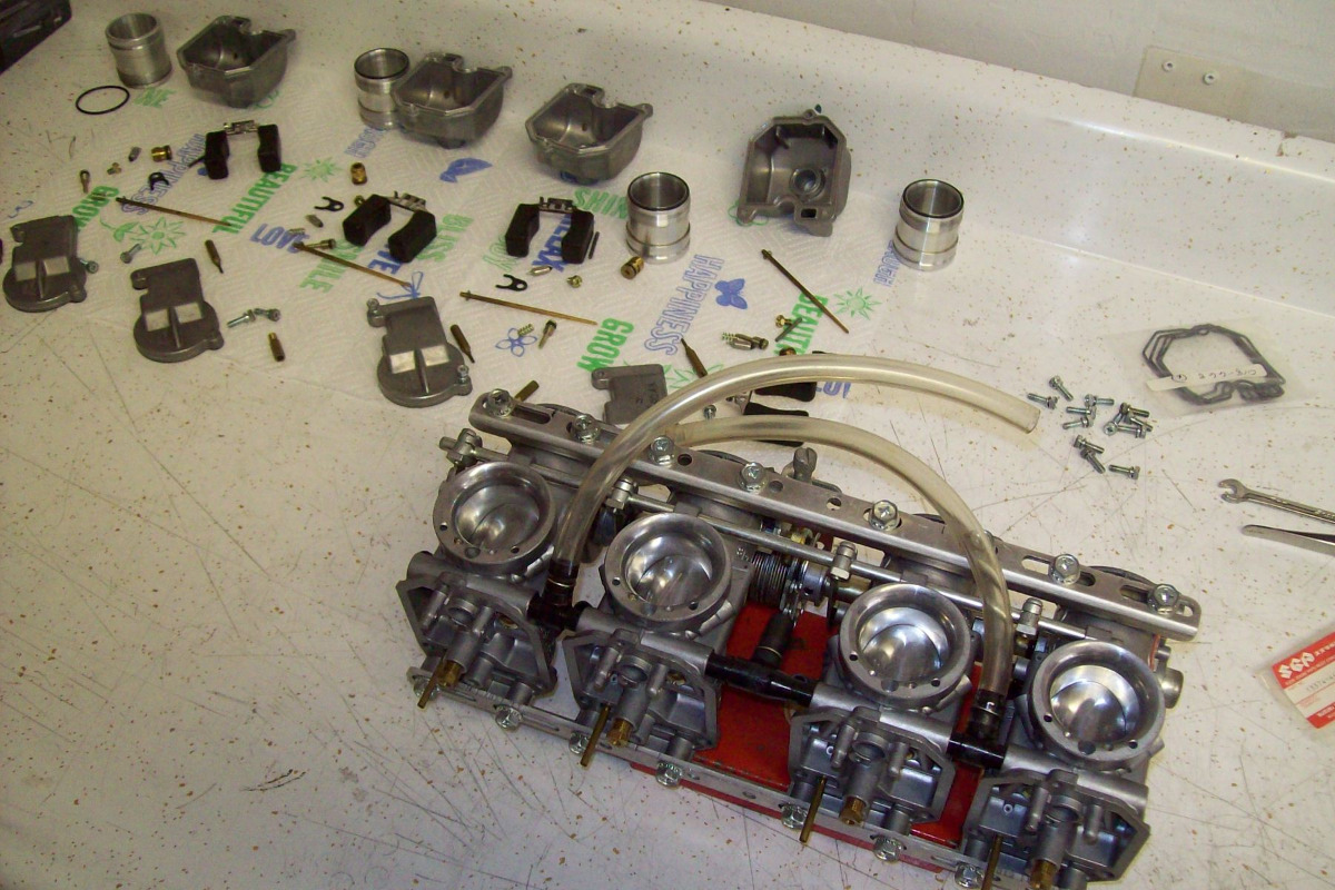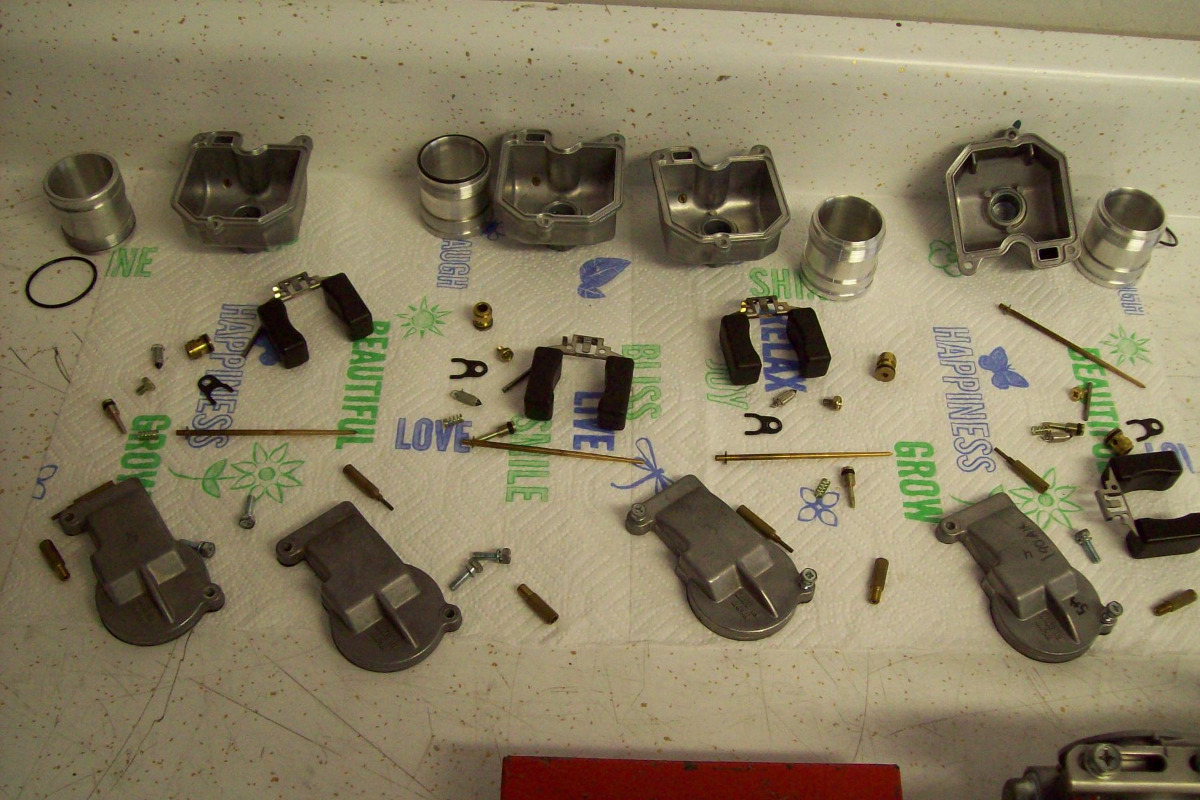Still waiting on my cylinder head to arrive. So I am getting everything else ready for final assembly. The CR Keihins that I am using on this bike have sat in a box for 32 years, When I fired the bike up last year for the first time, I had some fuel leaking out of the inlet fuel tees. So I decided to replace every O-ring in these carbs. Glad I did!!!!! They were all flat, and mostly hard as rocks. I had all but one O-ring on hand. So I only had to order one O-ring. Plus I decided to lean the jetting out just like I had to for my Mikuni flatslides on my GSXR750. I had to drop 4 main jet sizes just to get a nice plug color. So I did the same on the CR's. Lean is mean.