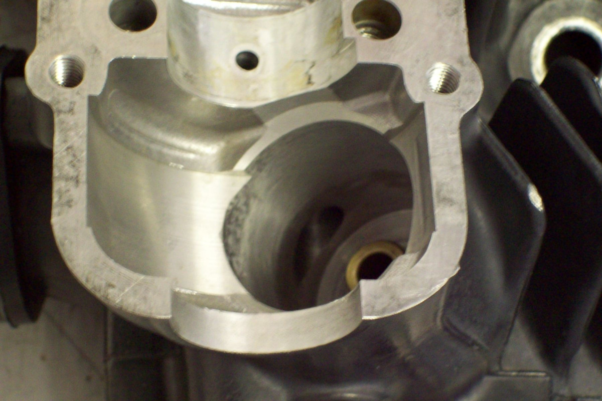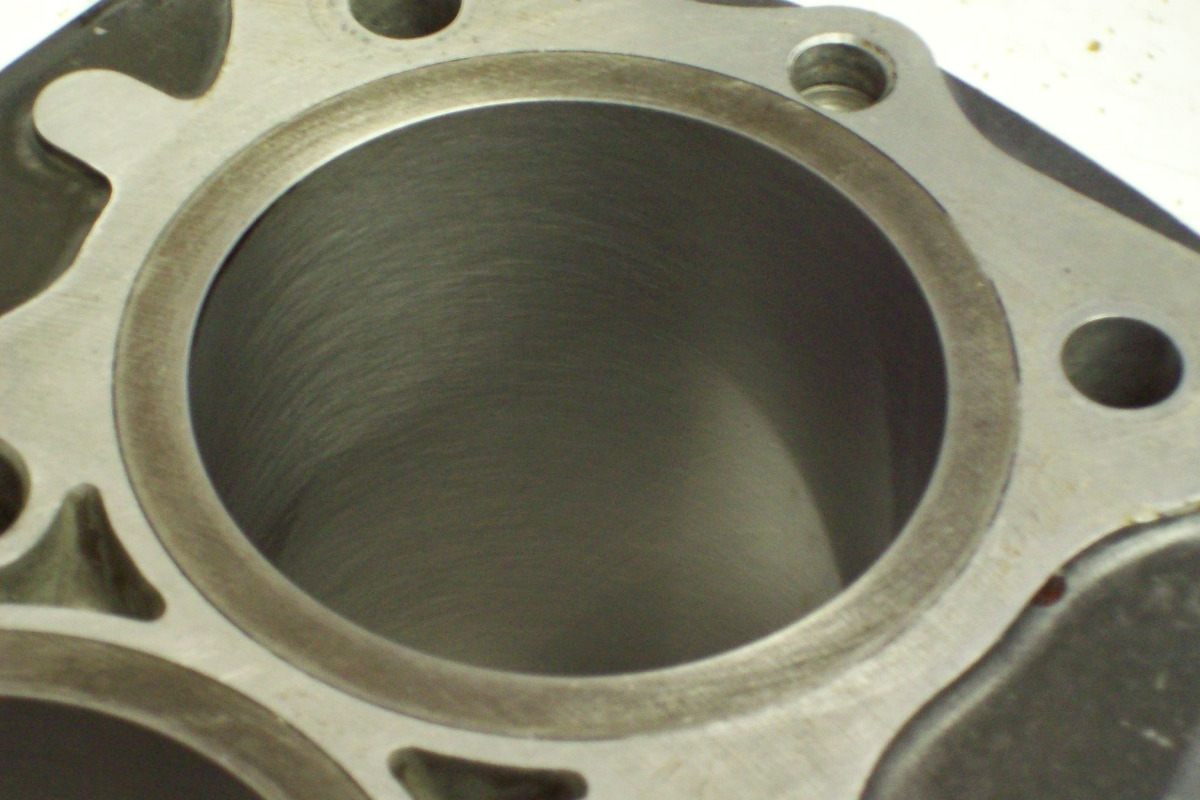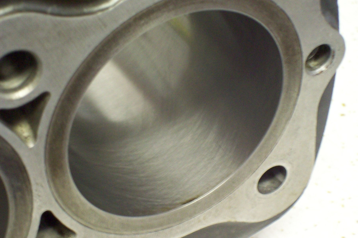 The cylinder has been freshly honed. Got a real nice cross-hatch pattern. Smokey would definitely approve of the way it came out. I forgot how messy honing really is!!! I got little drops of honing oil all over my nice clean bench, and surrounding areas.