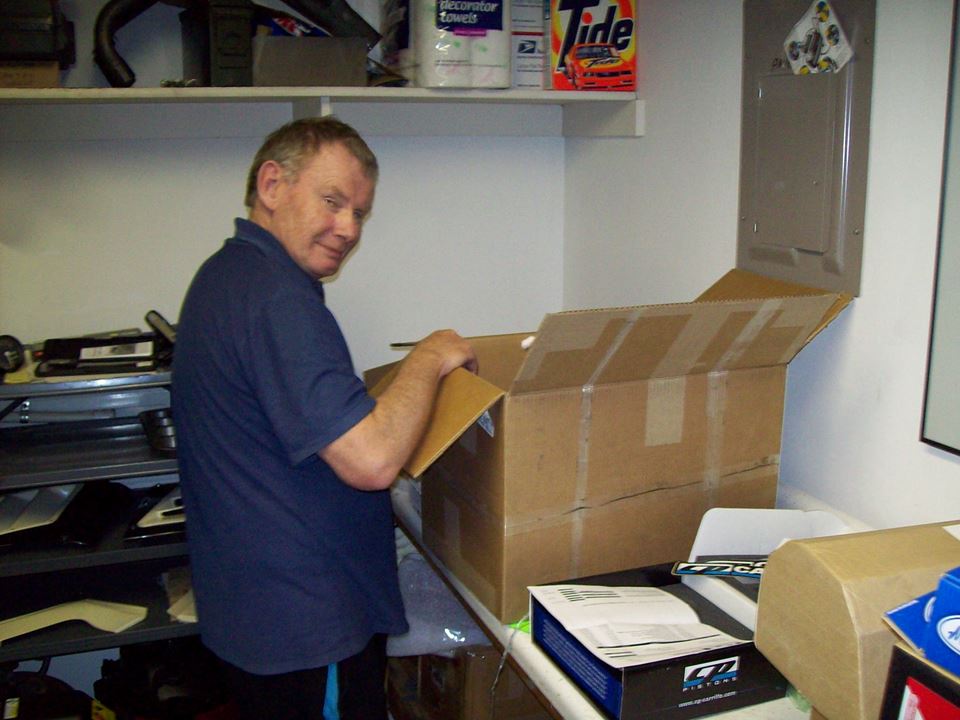 Wayne going through all the big buck race parts he ordered for his Kz Superbikes back in Oz.