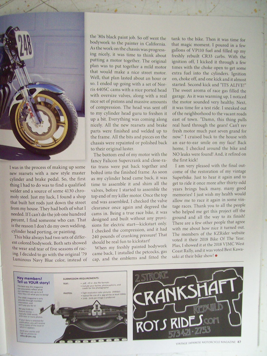 Well they didn't put my Superbike on the cover of the Vintage Japanese Motorcycle Magazine, but they did print my article that I wrote about my restoration of my KZ1000 Superbike. It was only a four page article with my own story line. I posted here each page so if anyone wants to read the article, they can. Or you can join VJMC and receive their magazine with my article in it!!!!!