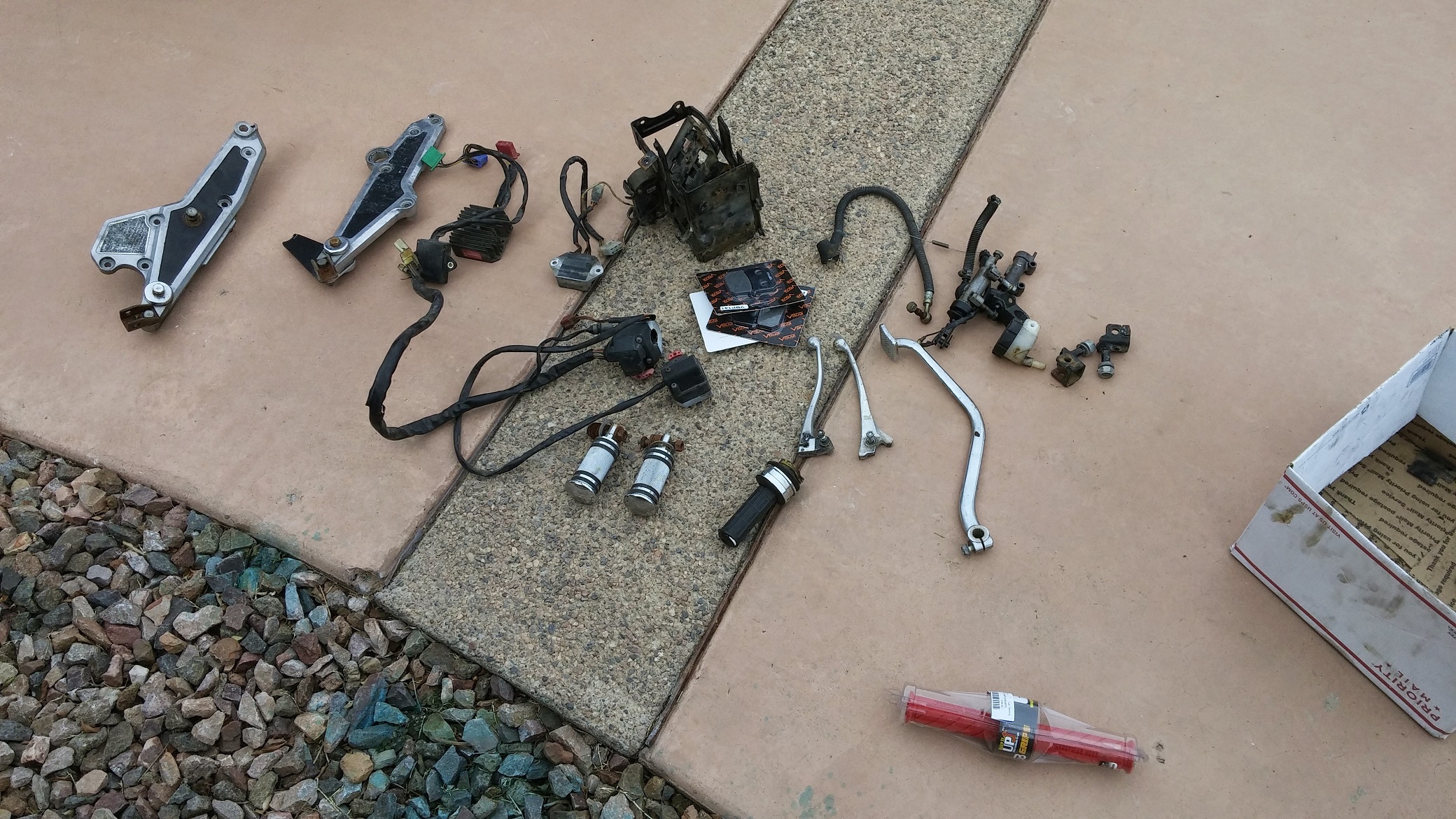 More parts! picked from two different salvage bikes haha. Few more pieces to pick up tomorrow, as well as a fresh battery. Clutch and throttle cables are on their way from Parts Unlimited as well.