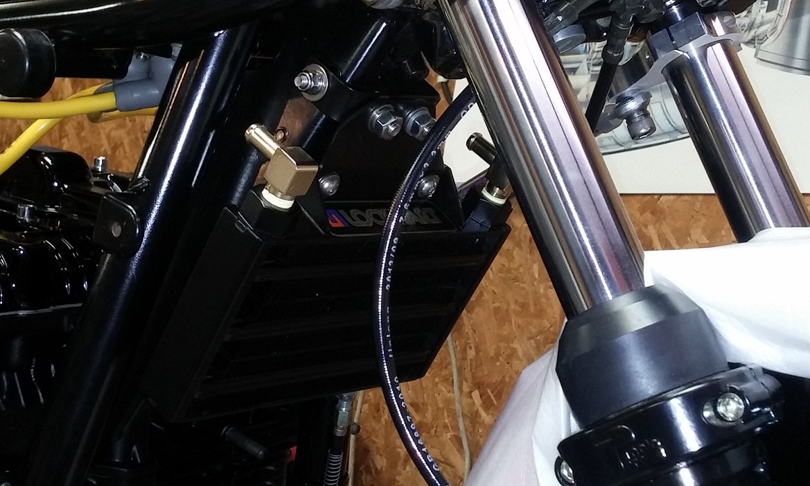 Mocked up the oil cooler with several different mounting brackets. Settled on a simple U-shaped bracket.