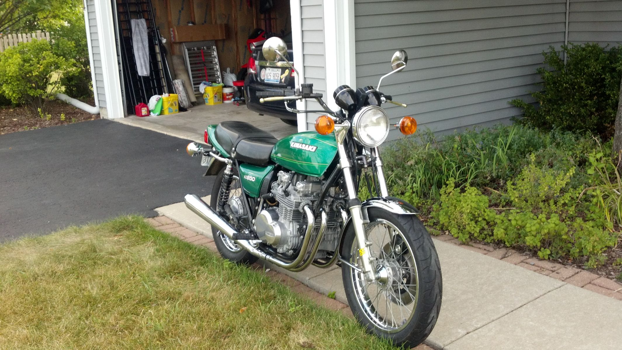 I am proud to announce and show how the KZ turned out after finding an original in the box Emerald Isle Green fuel tank. I also found a local paint shop that specializes in motorcycles. I was able to match the side covers and tail to the fuel tank. Got some decals through Z1 Enterprises. After some more spiffing, voila! A fair representation of an original low mileage stock KZ650 B1.