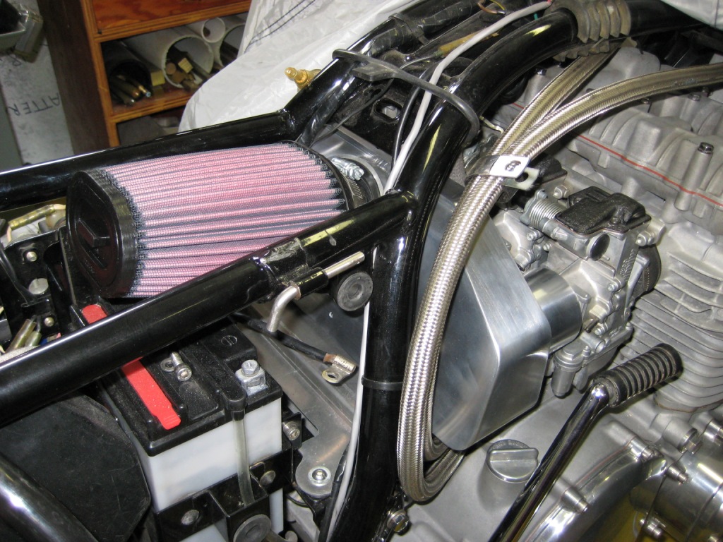 I have a trick intake planned. The Henry Abe "bread box" air filter has severed me well but it think I can do better. I am going to build an intake that goes from the carbs to underneath the seat to a single filter. It will look like a header collector but for intake instead. I can't build that until my engine is back in the frame. Can't wait to get her put back together, the nice cool riding season is upon us here in sunny AZ.