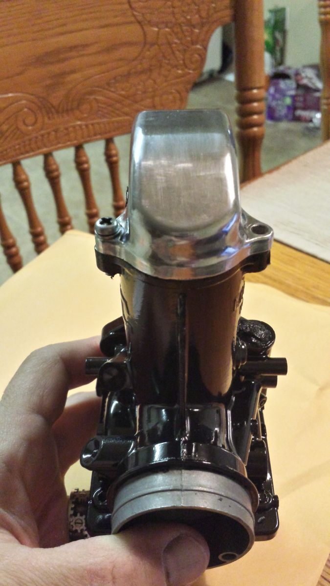 Well I gave it a shot trying to polish the entire carb body. Even with the cone shaped polishing bits I could not get in all of the nooks and crannies. My OCD would not allow me to leave areas unpolished. So I opted for VHT gloss black engine paint with polished caps and fuel bowls. I still have to polish the bowl in the pic but you get the idea. Let me know what you guys think. The engine will be the same black with polished covers.