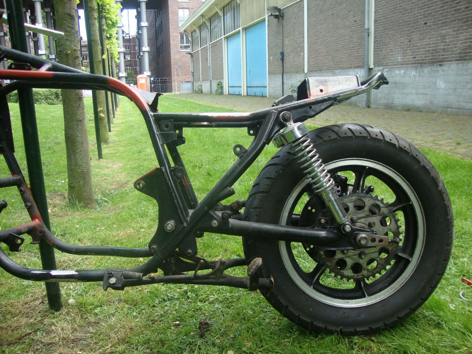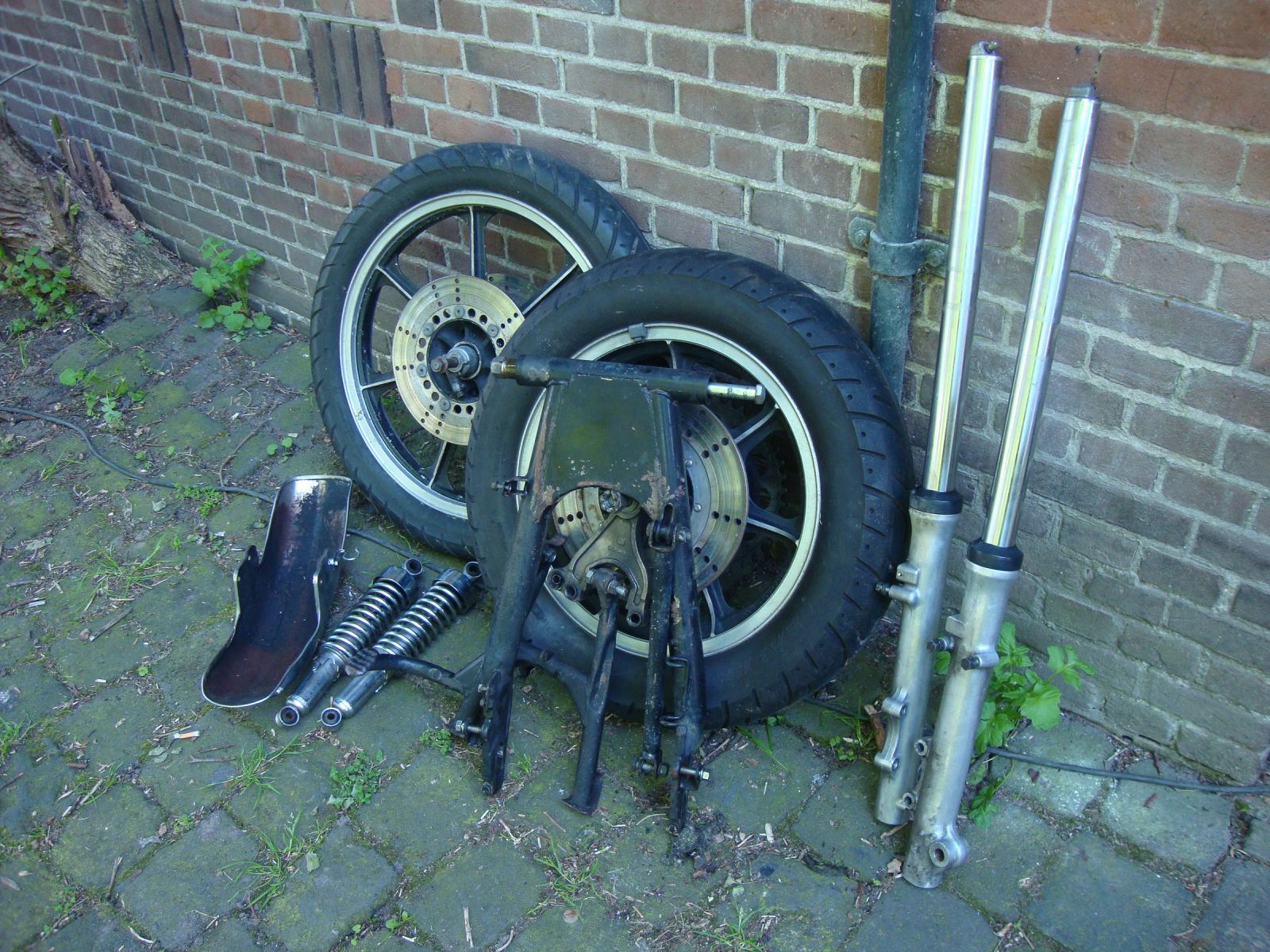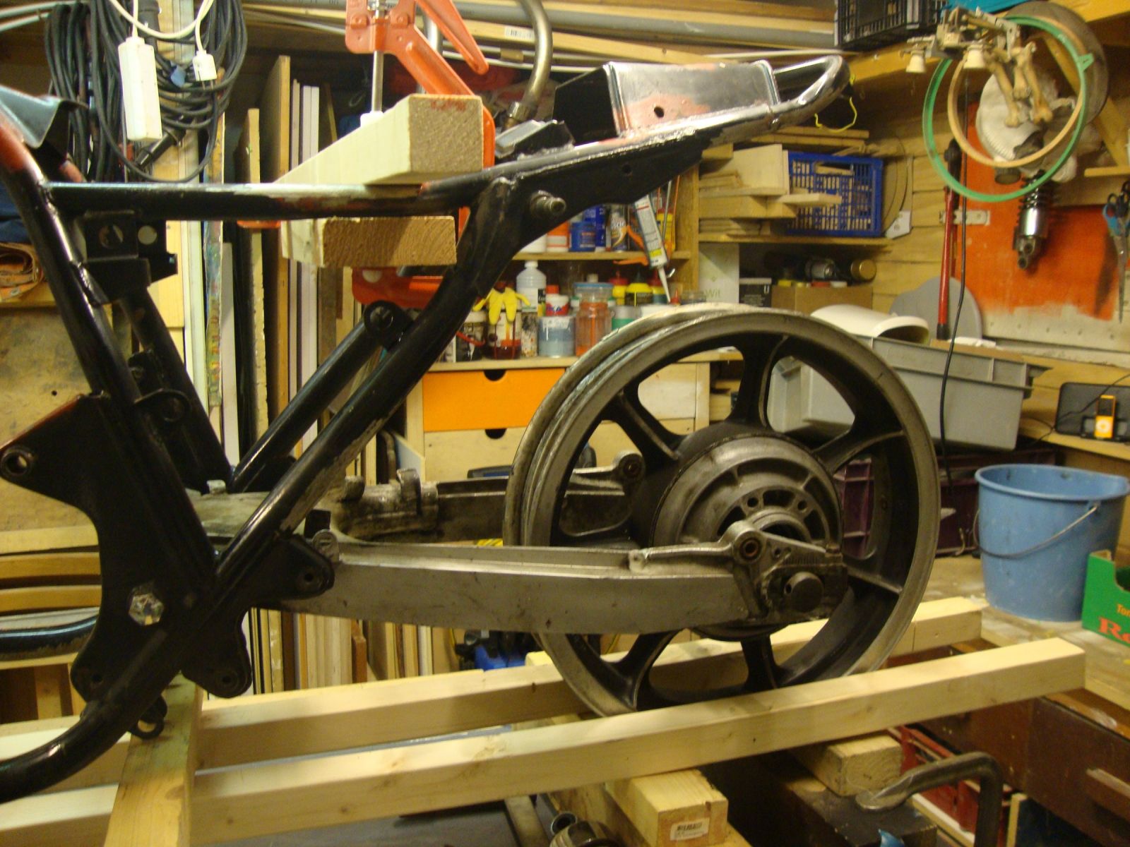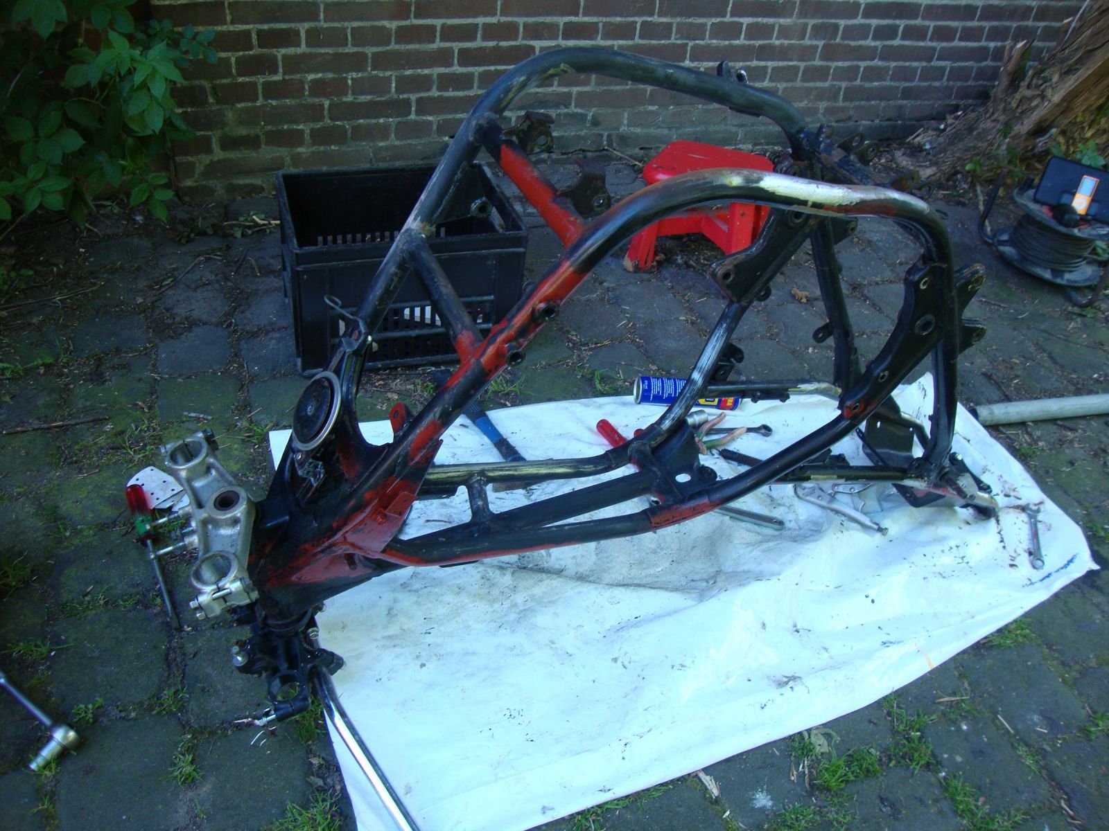 So,the engine is sorted,for now, and its time to figure out the rest of it. The frame is stripped,delugged.The wheels and swingarm are bearingless and its all ready for the powdercoaters.
