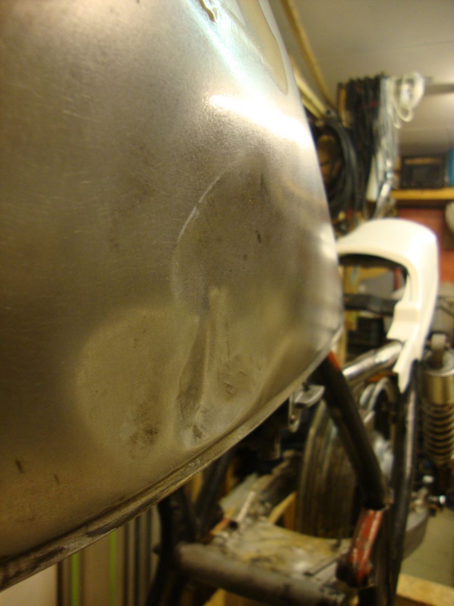 The other thing that Im not sure about is the paint/colour. When i got the bike,the tank was 'brushed on' black paint with a big brake fluid spill down one side of it. I stripped it down and found a lot of body filler on it. I really liked the idea of a bare steel tank with some sort of clear coat on it but I dont think thats going to work with all the dents in it. I have no idea what the P.O. did but it looks like he attacked it with a hammer.