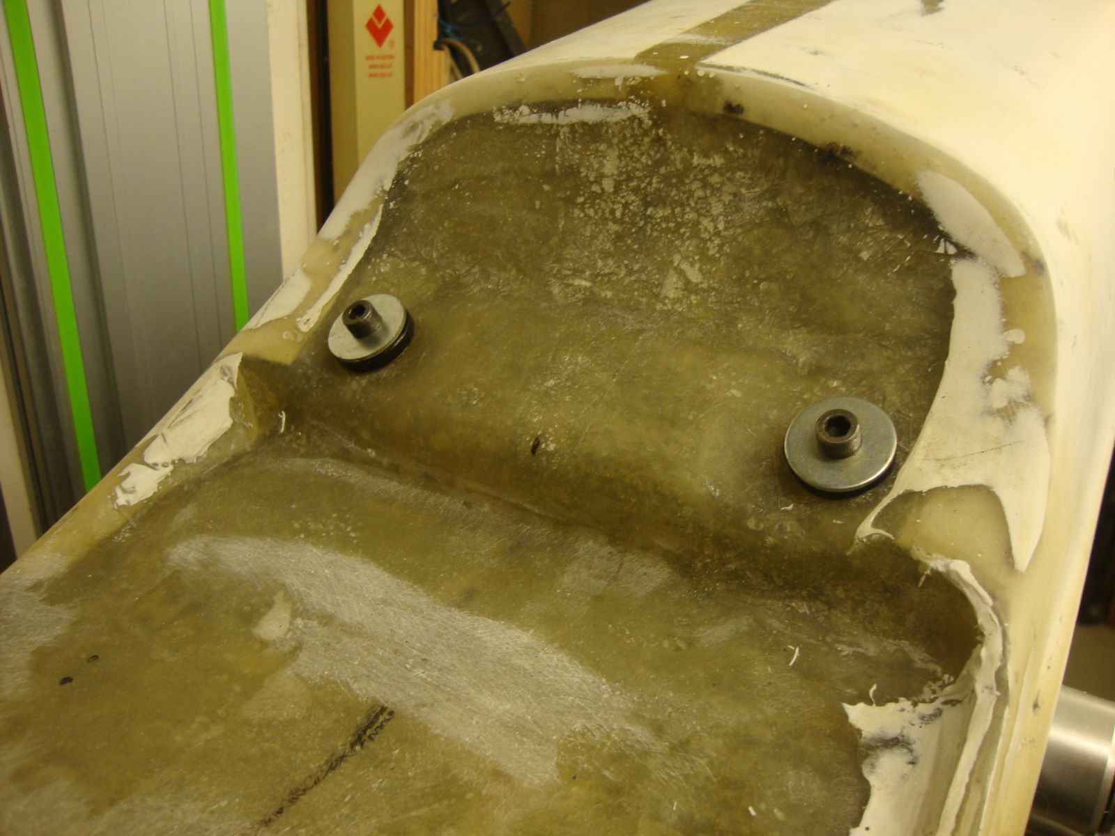An allen bolt,a threaded masonary plug,a steel washer and a rubber washer. I drilled the plug out to accept the allen bolt and cut it to length. I drilled out the rubber washer to go over the plug. Put the steel washer on top of that so I have a sort of rubber insulated top hat spacer which I can tighten down enough to hold the tailpiece firmly but not crack the fiberglass .