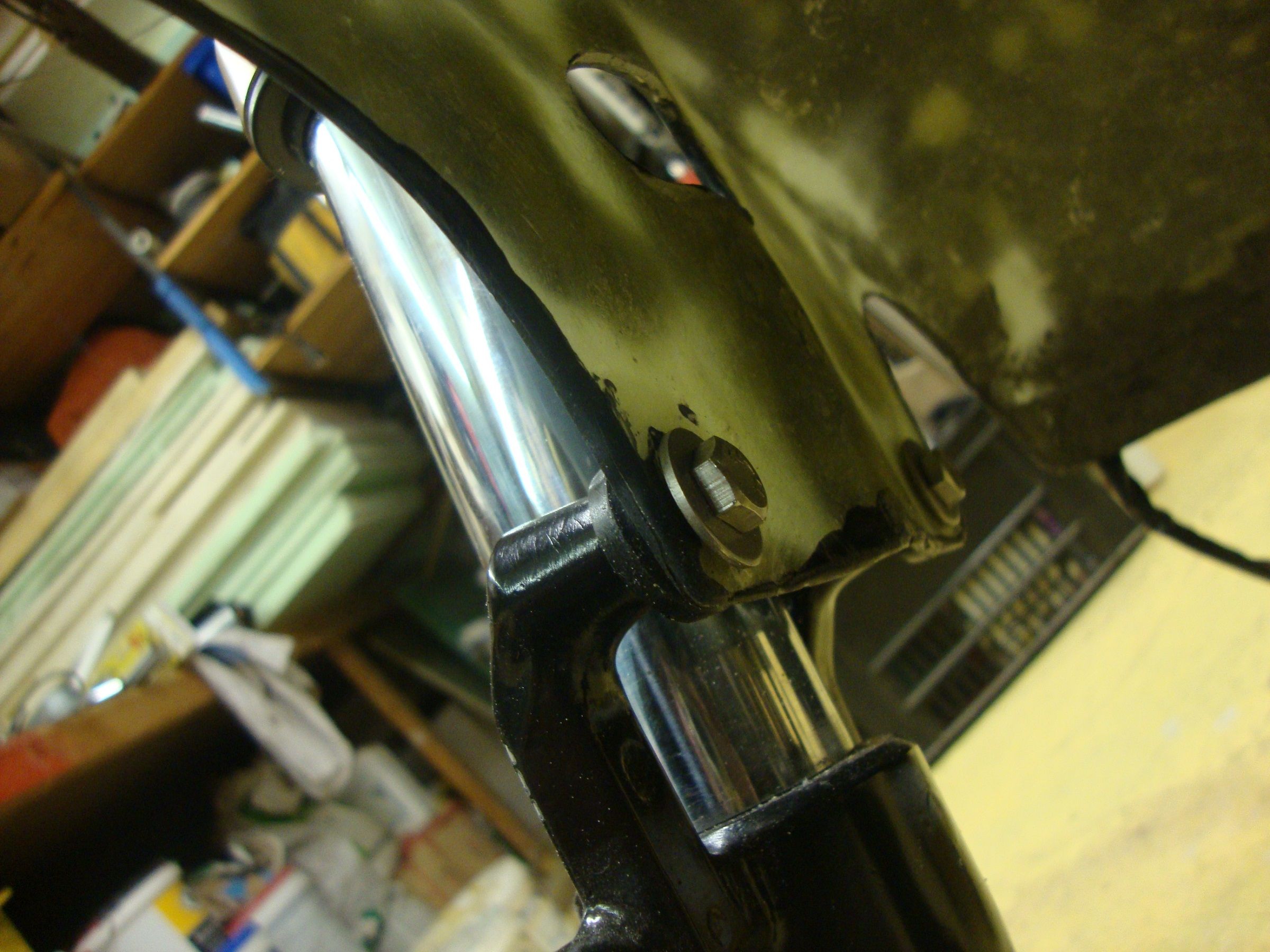 I cut some alu pipe,long enough to go through the fiberglass and a rubber washer,I made the rubber washers from some CB750 valve stem seals I had,mounted them twixt the fork leg and the mudguard and tightened them up,with another steel washer under the bolt.