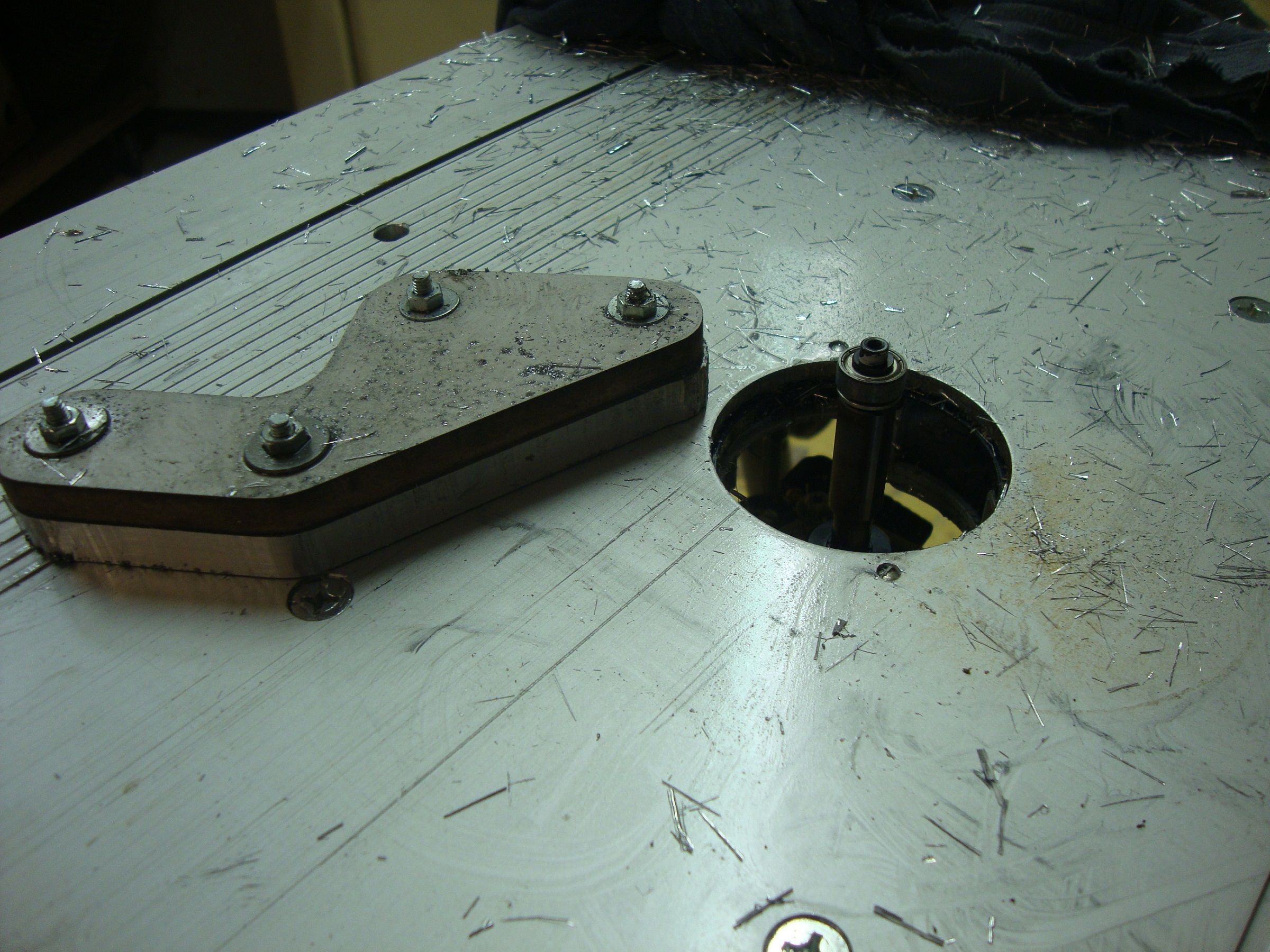 Learning from my mistakes,make sure the template is as perfect as you can get.Sand the edges totally smooth.Any imperfections will be transferred to the alu. I cut the alu back as close as possible without biting into to the template,Its easier to cut it away and beetr for the router as well. With a copy bit in the router table and lots of WD40