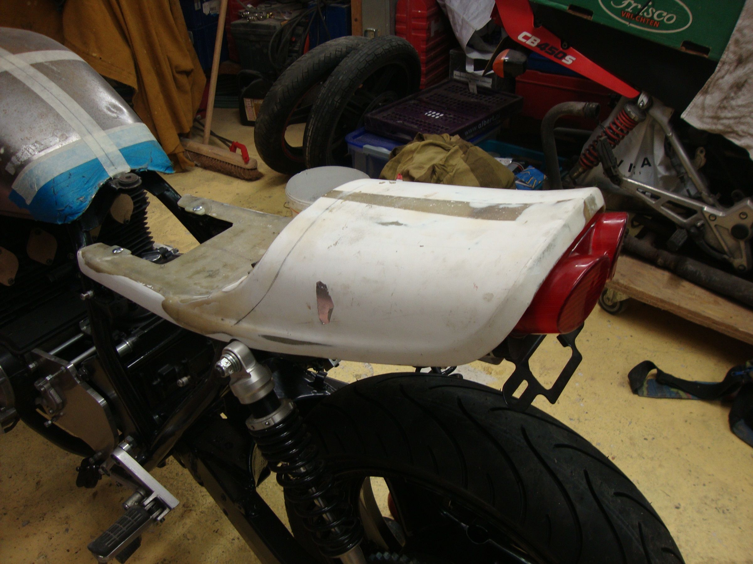 The 'Ducktail'. Yes,Im well chuffed with that. It was a fiberglass Z1 repro from ebay..It was too narrow for the frame so I had to slice it down the middle and re-fiberglass it. The whole process is earlier in the thread somewhere.(my first time fiberglassing!).I still have to sand it and fill some small holes before painting.Thatll come later.