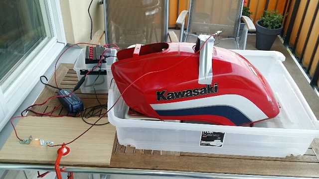 Davido when I ran the electrolysis method this summer on my ZX750A1. I put the tank in a Curver under bed storage box that I picked up on Bauhaus for cheep, so vinegar/sodium carbonate solution would not run of my balcony.