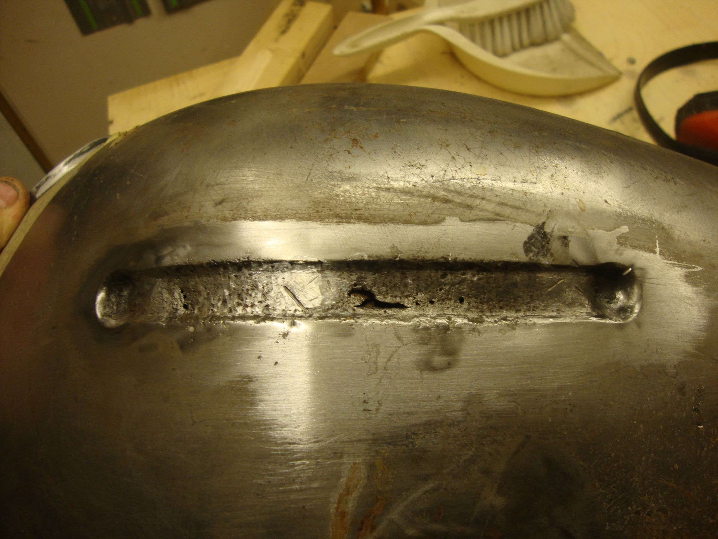 Well,my interweb has been down for a while now.finally back on so time for a progress report. I got the tank stripped outside and in. I cut out the brackets for the tank badges to get at the rot behind them and wot a lot o rot it was