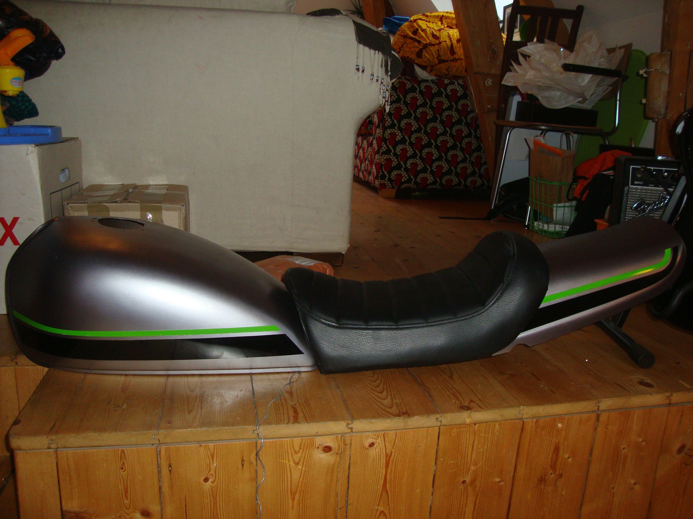 The swingarm is on the back boiler for now. The family is off for the holidays so the back bedroom has now become a paint booth. Ive got from now til new years eve to get the tank,tail and mudguard painted and clearcoated, get the back bedroom cleaned up and the smell out of the house!!