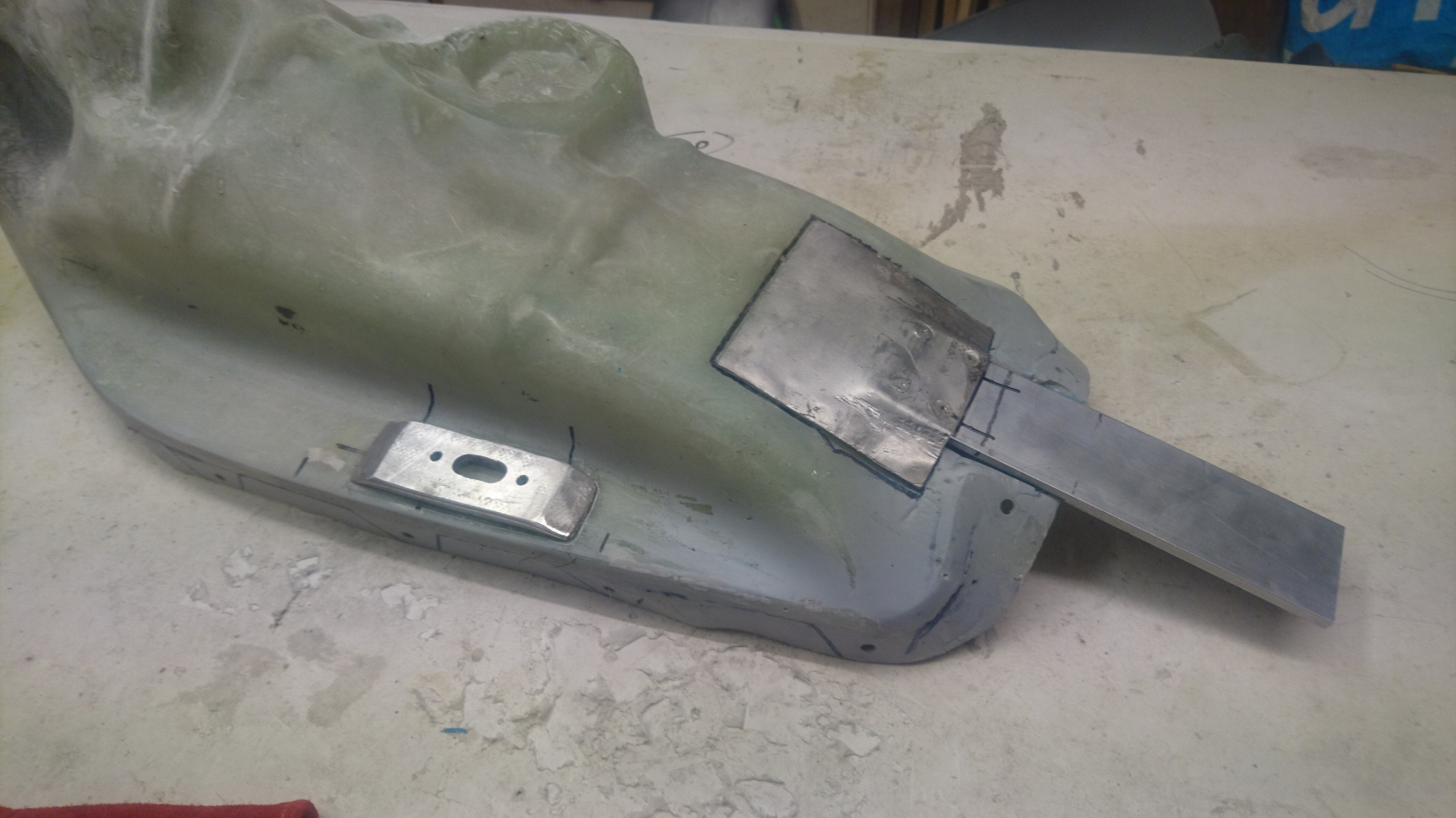 For the rear mount,I riveted a strip of 8mm alu onto a 2mm plate to spread the stress.I made a recess for it all in the mold but it will be fitted at the end when everything is together.