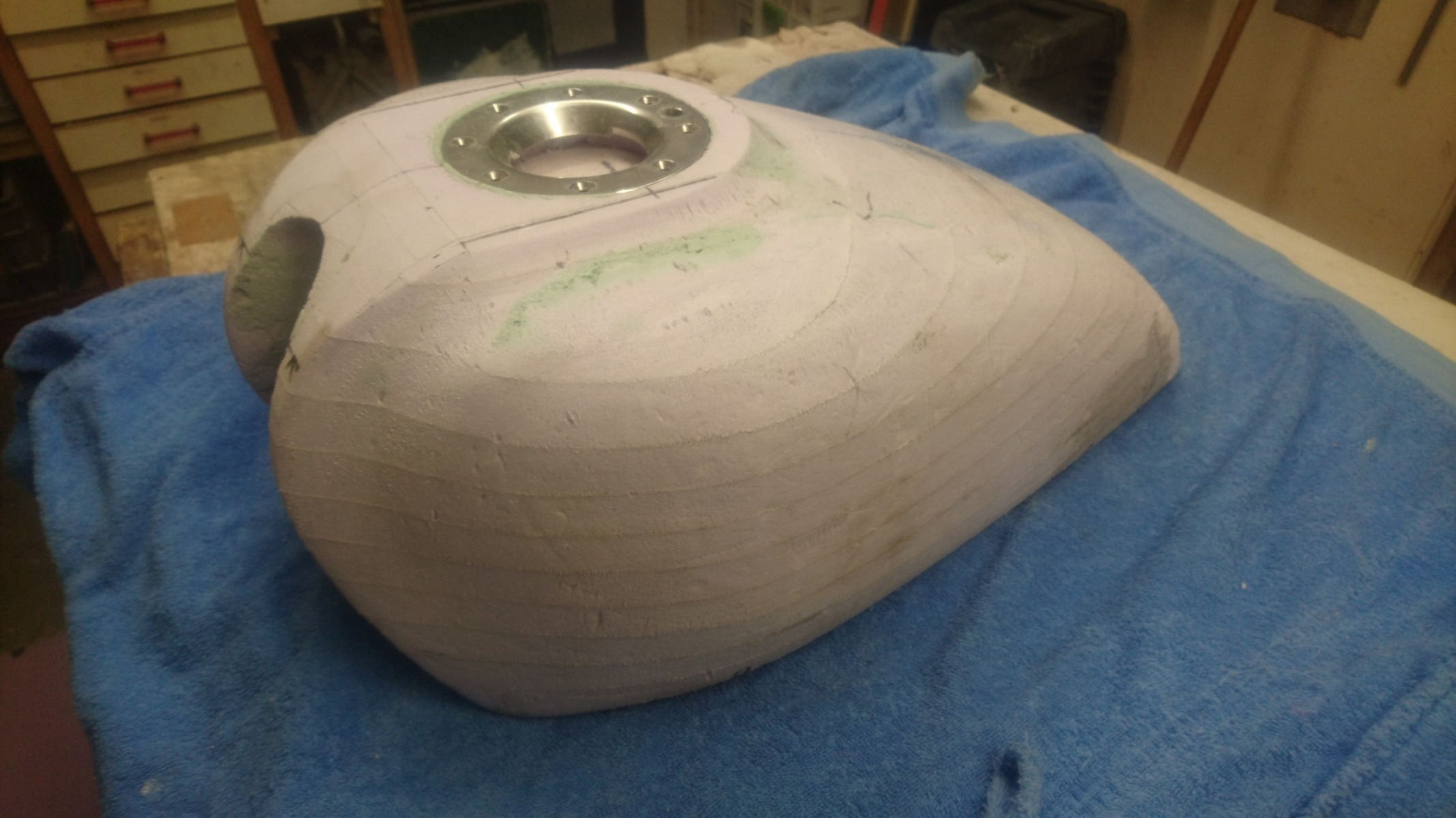 Next is to concentrate on the fuel cap area and the final shaping on the front of the tank to get a nice flow to the curves. Then a final sand over everything and that'll be it ready for the laminate.
