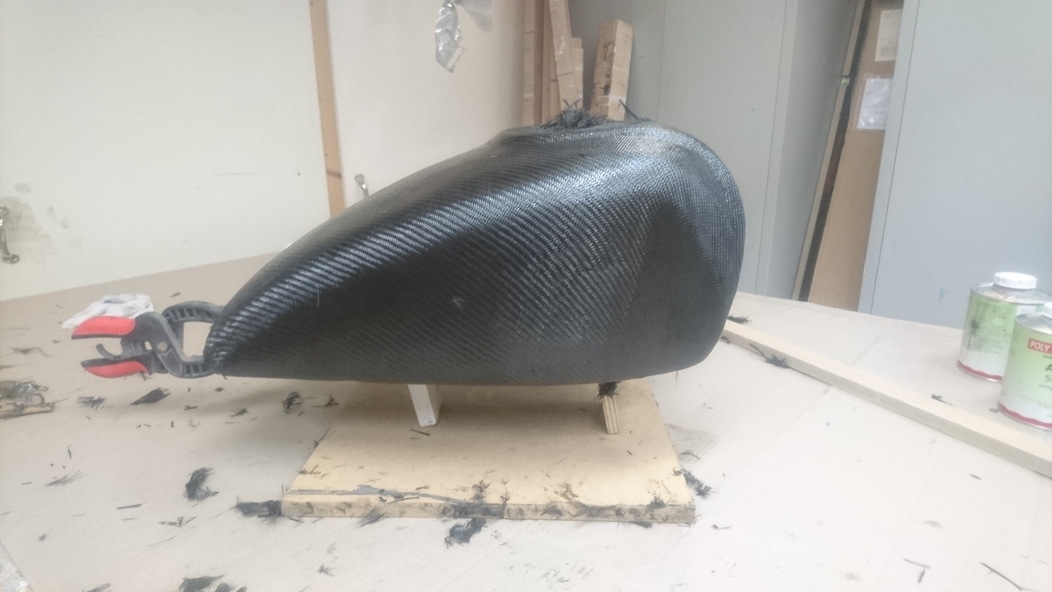 Did the tank top today. What a mess! I thought I had it all sussed out but wow. Covered in resin, carbon sticking to everything, It was like I had bushes growing out of my fingers.All my fingers! A real Laurel and Hardy day today! But its done. First layer on the top of the tank and the fuel cap recess fitted. So, that's all the hardware done. The rest is just building up the layers. Oh what fun!!!!!
