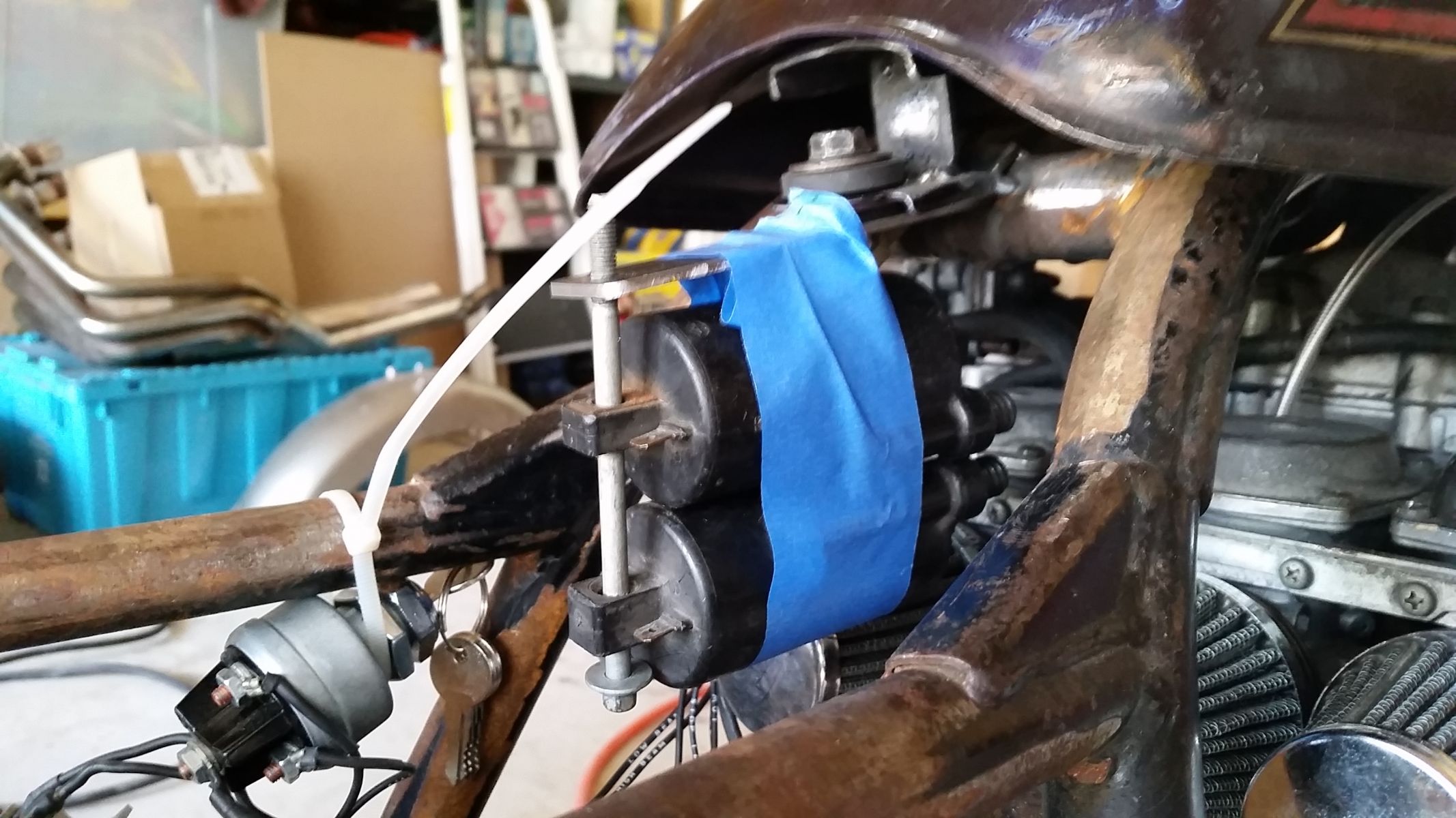 Well I got the tank bolt bracket welded up. I cut the bracket off of the tank and relocated it under the tank and about an inch or so lower to sort of hide it. I can always make the spacer shorter if I want the back of the tank to sit lower later. the bottom of the tank is currently almost parallel to the ground. It also has two holes for the coil packs to mount (pic shows them temporarily taped in location. Have to get some long bolts and tube to make the spacers and permanently mount them ... reason for mounting them on top of each other was so that the plug wire runs would be symmetrical and not have to cross each other.