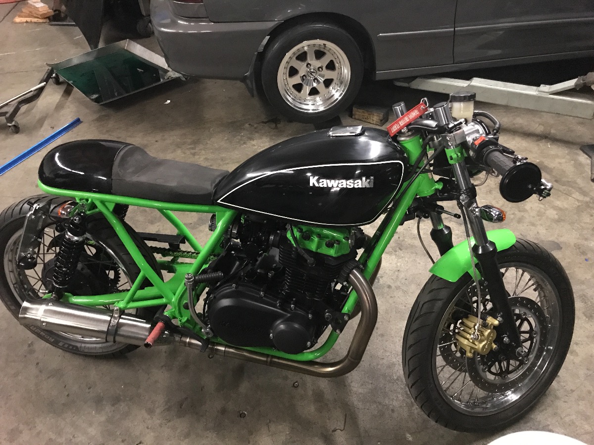 Got about 25 miles on her now. Gotta do an oil change and check/adjust the valves, clutch cable, drive chain comp test and check the sync of the carbs again then a plug chop. On the way to work this morn, I was getting some half throttle hesi underload, getting too much fuel there also felt like an intermittent misfire but didn't hear any popping or backfires from the carbs or exhaust. So as i got to the shop i pulled out my laser thermometer to get some temp readings, the right bank seemed to be running too cold (almost like it wasn't firing) so gotta look into that. But other than that, she ran and felt great! I was expecting to do an indo when applying the front brakes but they engaged nicely with a light squeeze. Can even hear the cross drills buzz pass the pads, so cool! hahaha. A more violent squeeze and yeah, it'll squat the front! had to test it a little.
