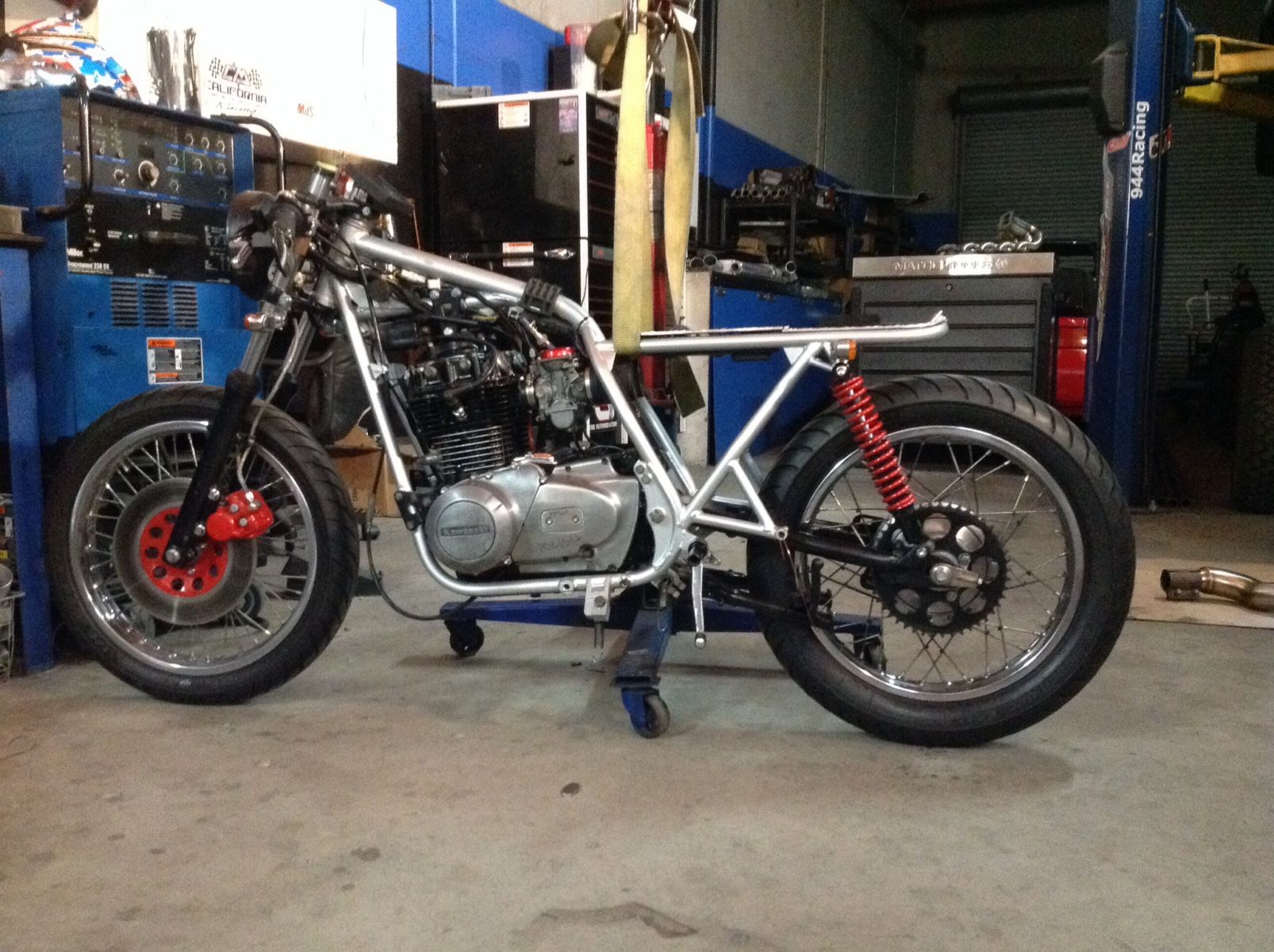 Well...coming together. lmao..I sat the motor on it's side in my welding chair and dropped the frame on. I reassembled most of the bike while it was on my chair. no pic though. But here's what else my tranny jack does in it's off time. Absolute help when fabbing turbo manifolds under the car..