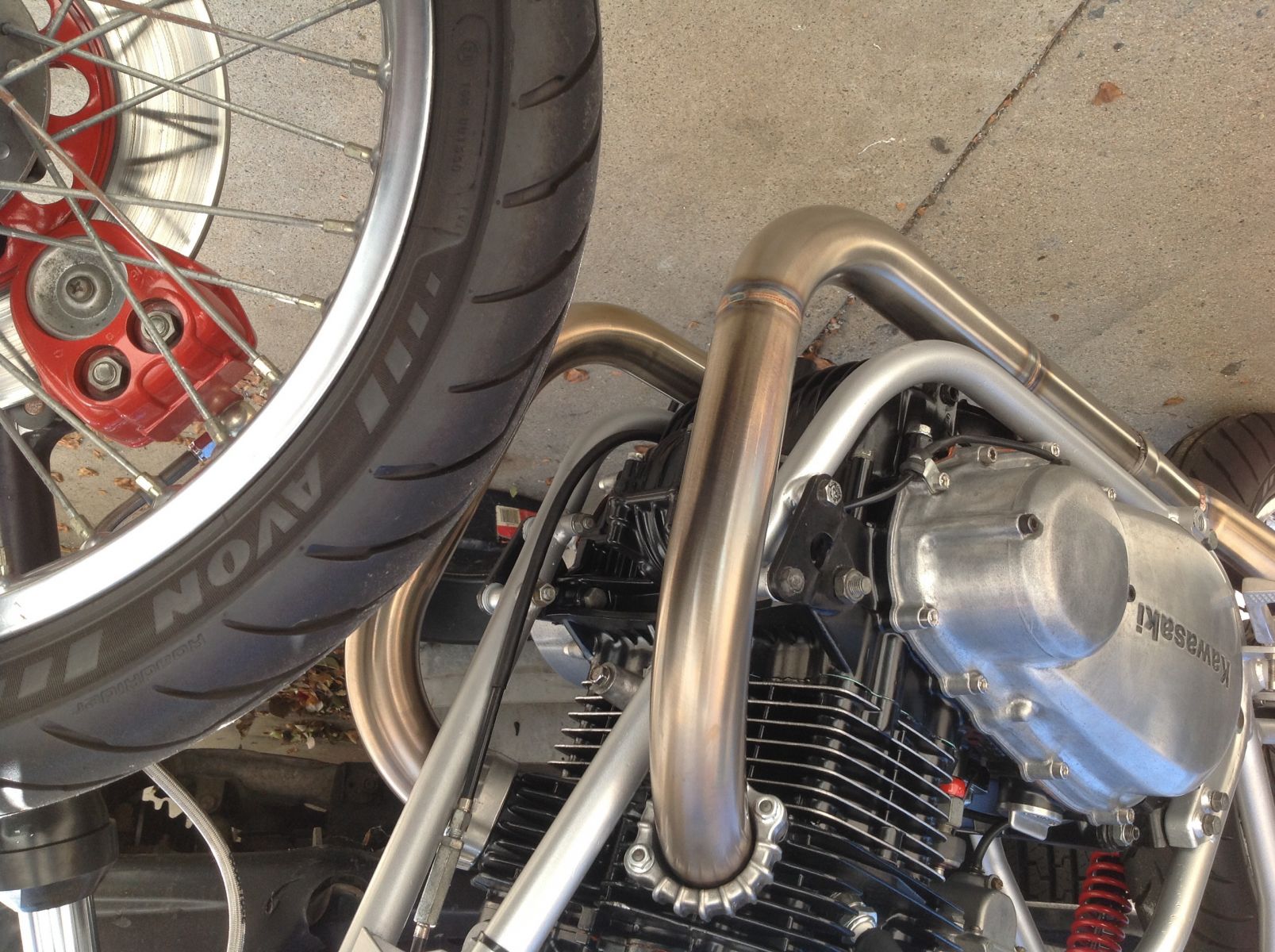So I should've taken pics when doing the header/exhaust. At this point I wanted to get the bike back together is I can ride. Did a 2-1 with a 18" rolled edge slash cut exhaust tip i normally use for 944t exhaust laying in my scrap stainless bin. Oh boy...did not like the sound of it at all!! It had an awful "tinny" sound when revving. That's only acceptable in honda civics