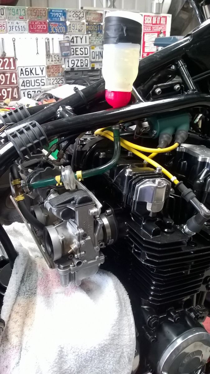 Packed a paddy with having to wait for new push pull cables for the Mikuni carbs to arrive so had to make some adjustments to get things rolling again using the original KZP cables, Yes, I know, looks a bit dodgy but hey it works!