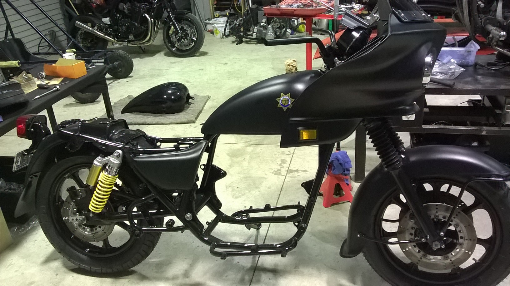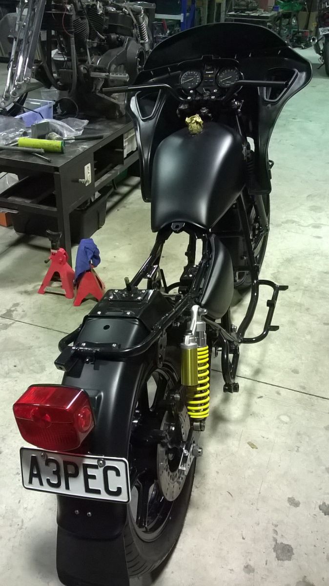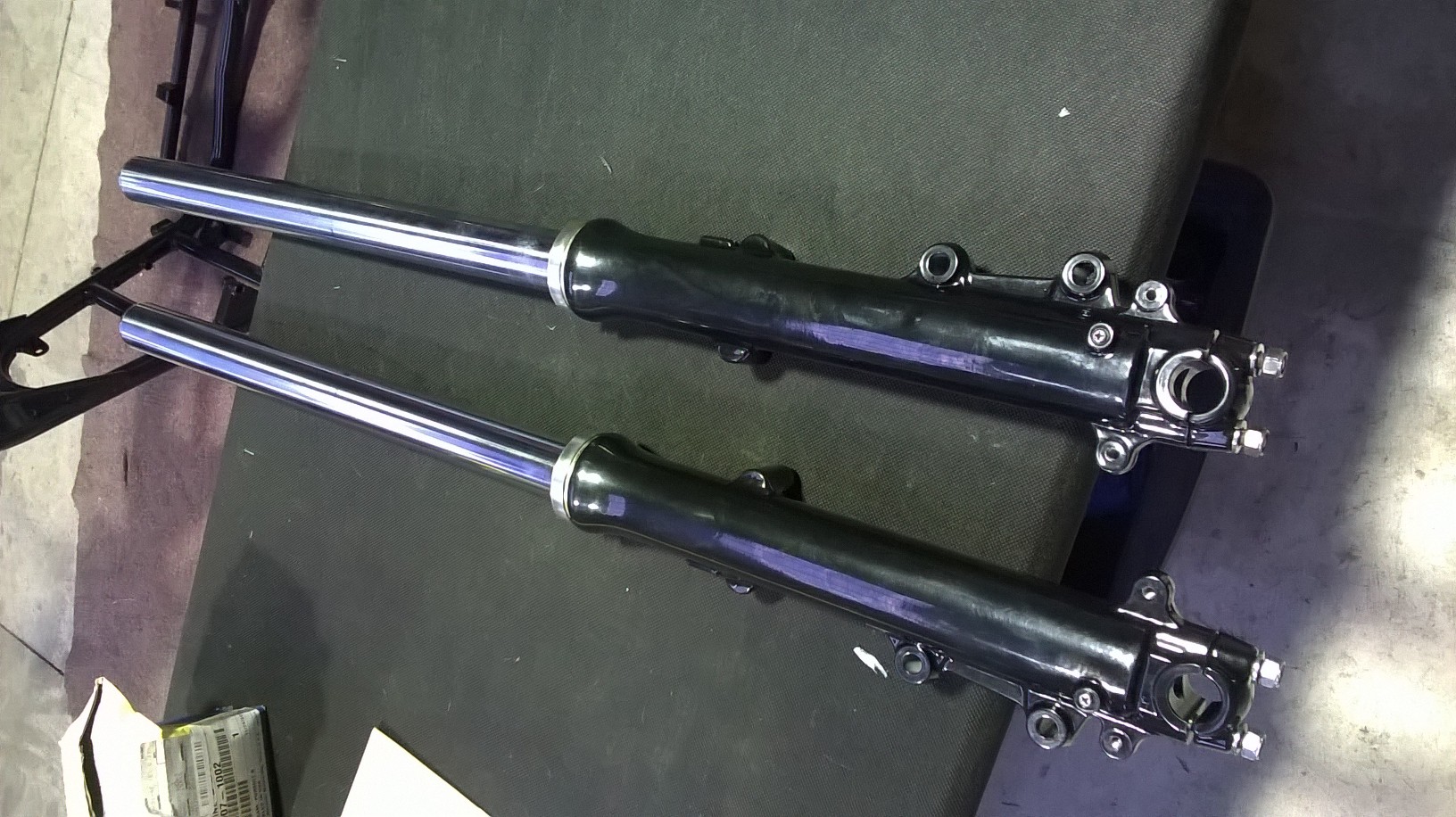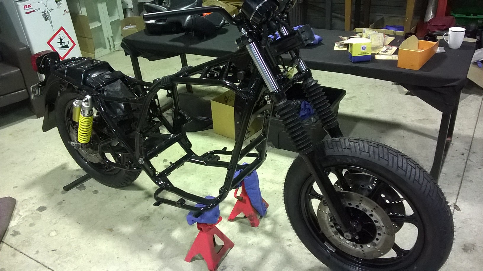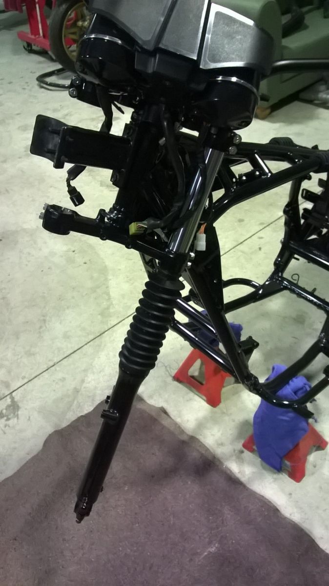 Finally the bushes arrived and forks are back together! Onwards we go then. Forks are back in and the front wheel fitted before I had to go out with the wife for dinner. Tomorrows another day............................