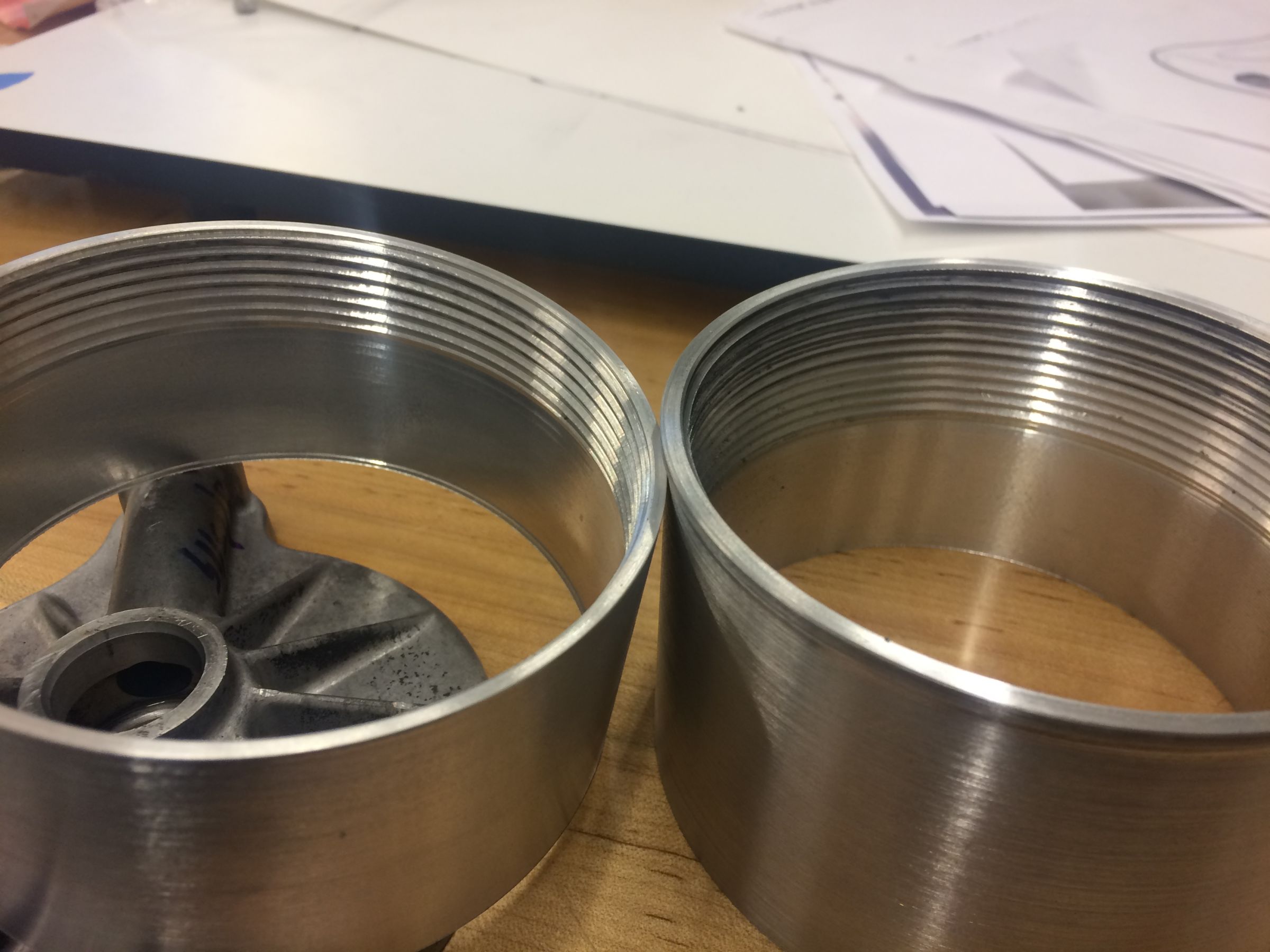 Had a little down time today so I re did the gauge housing. The threads are much nicer this time. You can see the one on the right has less chatter in the thread. I also added a little lip that I will leave polished with the rest painted.