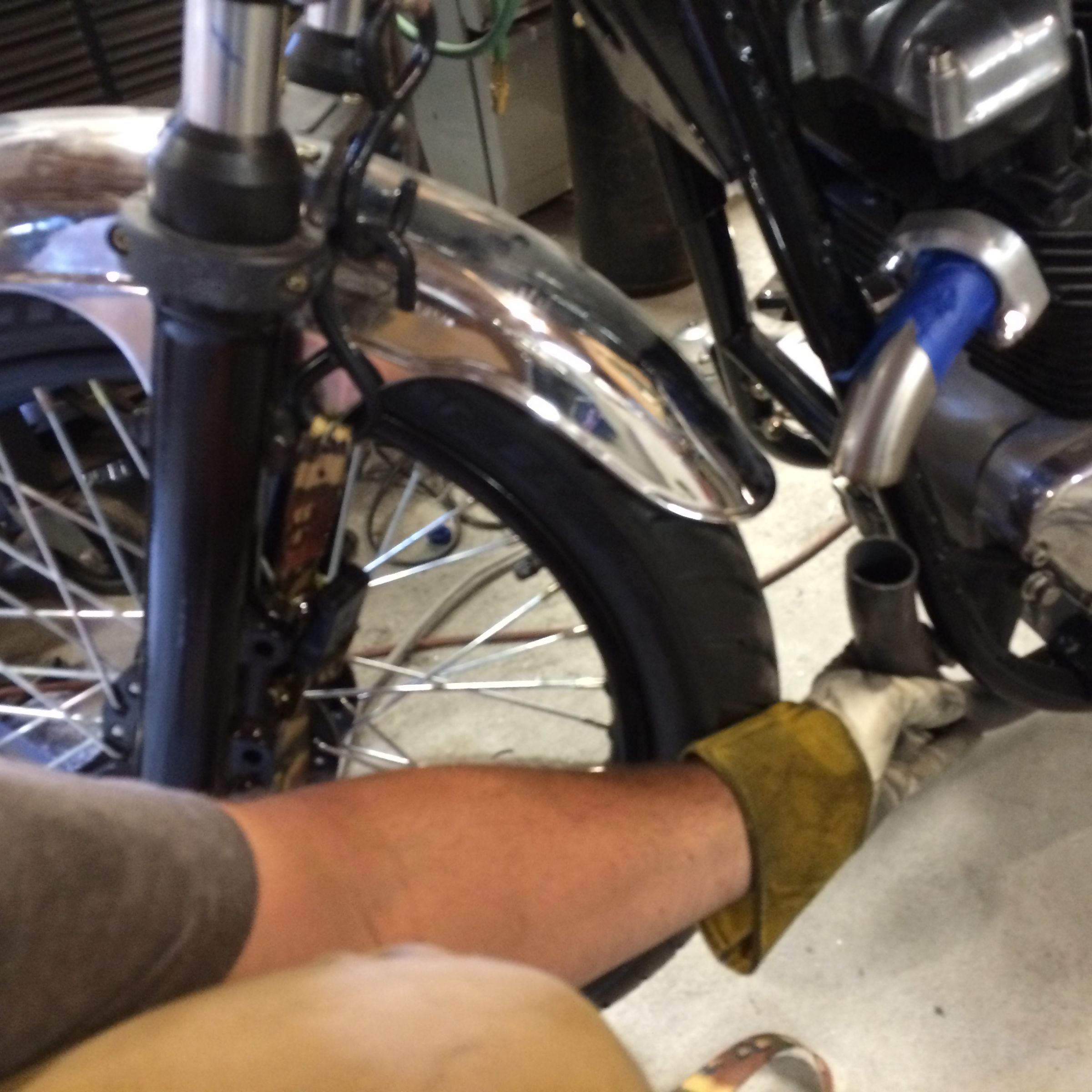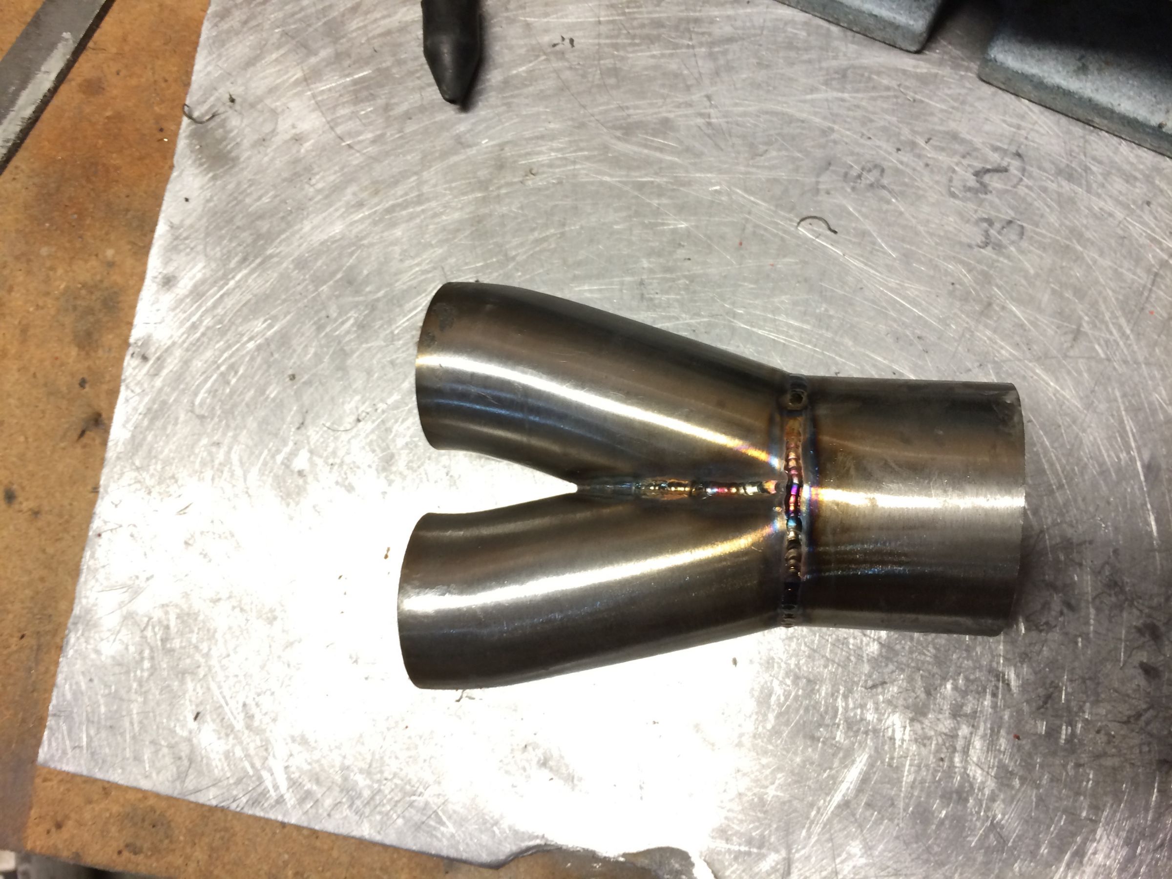 I hammered open the ends of the primaries and then faced them on the disk sander before welding them together to try and keep stress out of the welds. It still took a good amount of bashing after to get it to fit up.I also ovaled the big tube slightly to help out the transition. I was super shaky welding this up for some reason so the welds arent my best, I probably should have done some practice beads first to get in the groove but you will never see these welds when the pipe is on the bike, so whatever. I also compressed the fork to make sure there would be plenty of clearance. next up is sand bending the second bends.