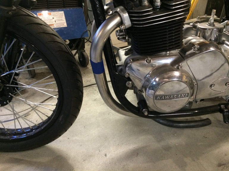 Whelp, I finally pulled my finger out and finished the header. It came together pretty nice, but I did have to fudge the fitup a little bit where the second bend meets the straight. You can't see it when its on the bike and I doubt it will affect flow very much. Eric made this sweet tool for putting a uniform finish on headers and it worked great, started with 80 grit and then a polishing belt for a uniform brushed finish before welding it all together. My welds came out OK, still a bit too hot, I'm undecided if I want to polish the heat marks off or not. I also need to start thinking about what I want to do about the muffler, thinking about a kerker-esque stainless can for that vintage performance vibe.