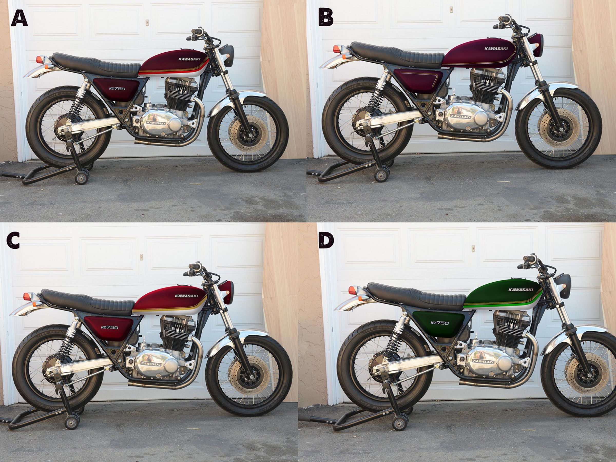 10 Sep 2016 09:39I was going to say C or D, but this photo beats both. That white trim on the bottom of the tank is genious. Somehow the whole bike looks lighter. The 750 twins always looked heavier than they were (and that's saying a lot). You already cut about 300 lbs off the bike, visually speaking that is, and the tank detail really highlights that.