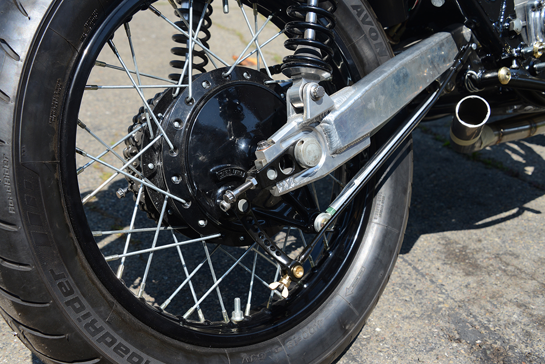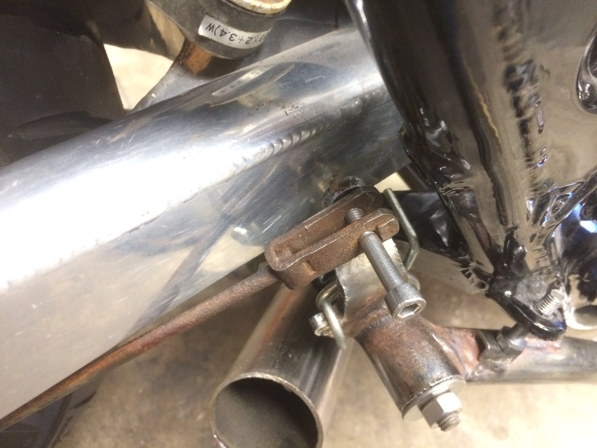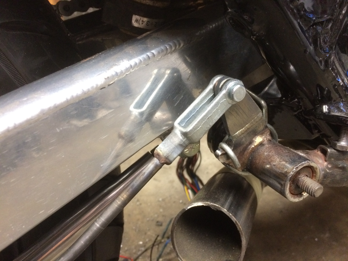The brake linkage is getting fouled by the new swing arm, so I am going to cut the tab on the brake lever where the linkage connects and move it out some. The problem this creates is that the brake pedal linkage mount is now no longer planar to the rear brake drum arm, and has to be bent into a dogleg to clear the swingarm. I mashed on the pedal pretty hard and it didn't seem to bend the dogleg linkage back hardly at all, but it still makes me wonder if its good. I'm thinking about making a new linkage rod out of chromoly and doglegging it. Thoughts?