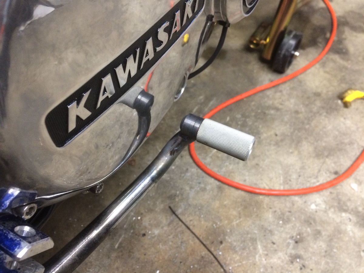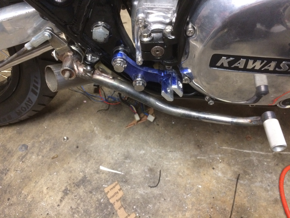 I have been fiddling around with the foot controls. got the kick-starter painted with a new detent spring and ball, shifter and rear brake arm are drilled and painted. The stock brake lever was bent pretty badly from where the PO layed it down, so I bent it back with fire. I still want it a little closer to the motor but its much better.