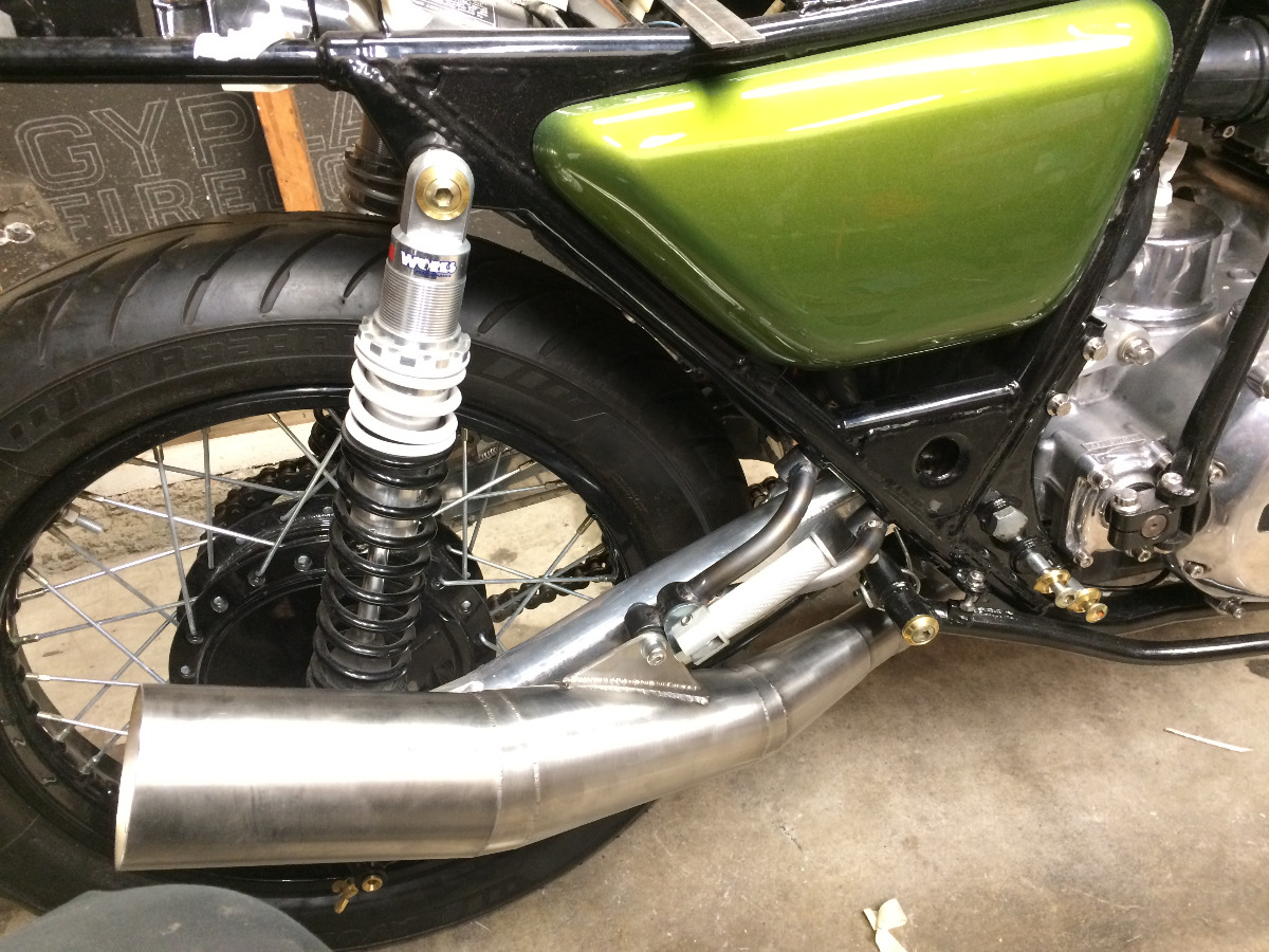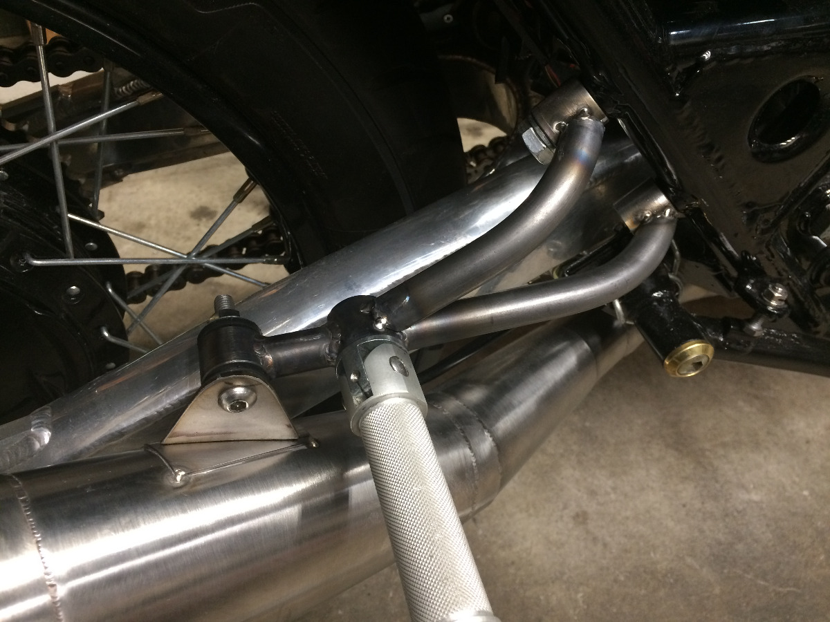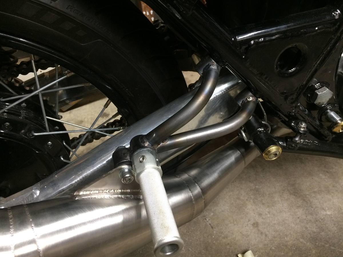 Made progress on the hanger and exhaust mount. I'm using some Tarrozi folding pegs that were intended for a different project. They're a tad long for passenger pegs so I will probably cut them down eventually. The mounting bungs i originally turned were too big to look good so I remade made them. I'm not sure I like the placement of the "load spreader" (for lack of a better term.) The part on the muffler can that actually welds to the muffler, not the tab that connects to the rubber mount. It looks a bit odd to me, i might end up cutting a trapezoidal one to follow the lines better. I think there has to be a cooler way to weld on the tab but I'm not sure. Also I'm wondering if its thick enough; its only .065" while most I've seen have been .125" I don't want it to crack.