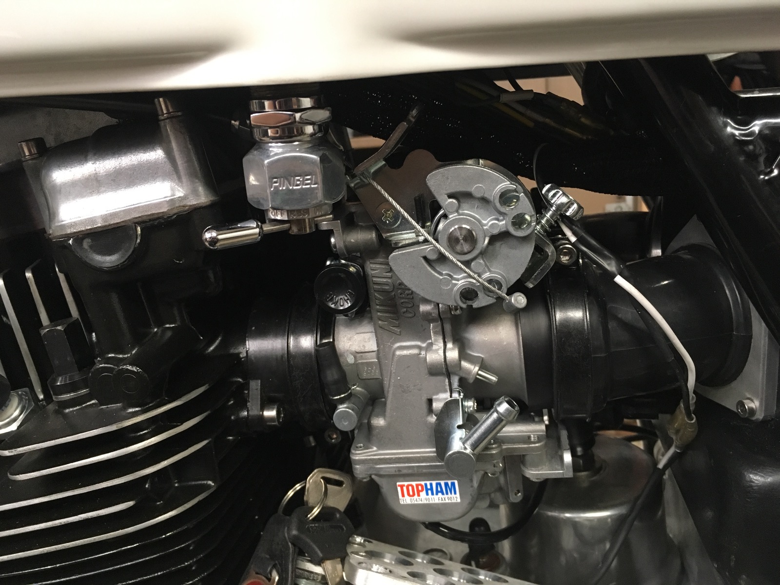 Engine is in the frame and everything is going back together. I installed the new RS34 carbs. I would like to retain the airbox, so I made these Delrin flanges to lengthen the carb body to fit with the airbox boots. This got me looking at the airbox itself. The K&N filter looks like it can flow plenty of air, but the cap that holds the filter on has a long down tube which is quite narrow in diameter (40mm). I'm thinking about trimming this all the way back to the cap and making the opening there as wide as it can be and still hold the air filter (about 55mm)