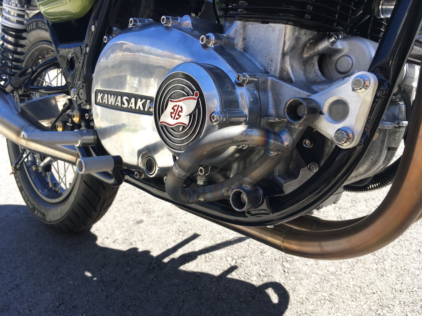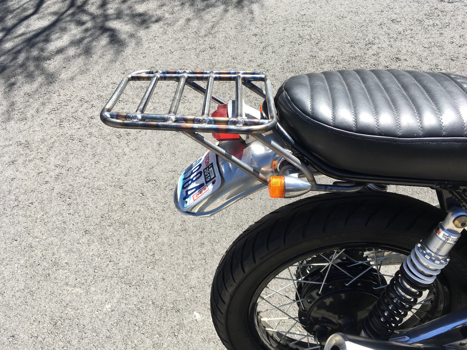 I short shifted and hit a false neutral, resulting in over revving the engine (D'oh!)The stock length shifter is just way too long, so I remade it again with a new toe peg as well. I added some bolt on braces for the luggage rack, and I also made some grab handles for when i don't have the rack on. Everything got powder coated in a super-durable textured black to contrast the frame. I didn't have much stuff to meet their minimum so i coated a bunch of other stuff as well like the top triple clamp.
