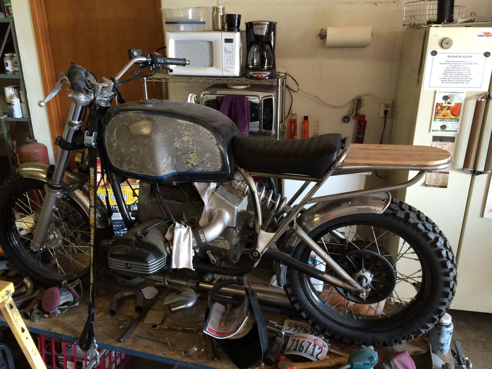 I mounted a road rider on the rear wheel, and dropped the bike off at my buddies shop. I just made him a seat for his BMW project, so for trades he is going to make me some wheel/swingarm spacers, and help me finish the swingarm fabrication. Cant wait to see the swingarm finished! heres a pic of his beemer.