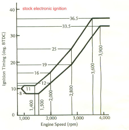 '81+ stock electronic ignition. idle= 10 degrees full advance = 35 degrees @ 3750 RPM