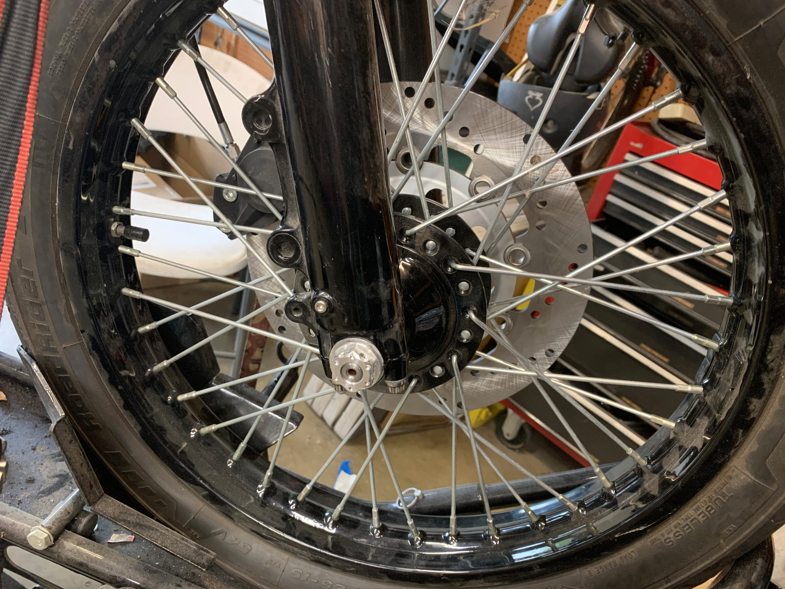 Progress.... One of the shocks was leaking so I had them rebuilt, I guess this version of Works shocks used some type of proprietary tool to fill nitrogen so they had to be machined to accept a nitrogen valve. Before tear down I had this weird pulsing/chatter at low speed with the new EBC disk despite having less than .005" of run out. I had the disk ground by Tru-disk to eliminate the surface as a potential source of the problem since that was all that changed from the stock disk, if this doesn't work I will look at some different pads. Also installed the lightweight custom front axle while i was at it. Hope to get the top end back from machining next week.