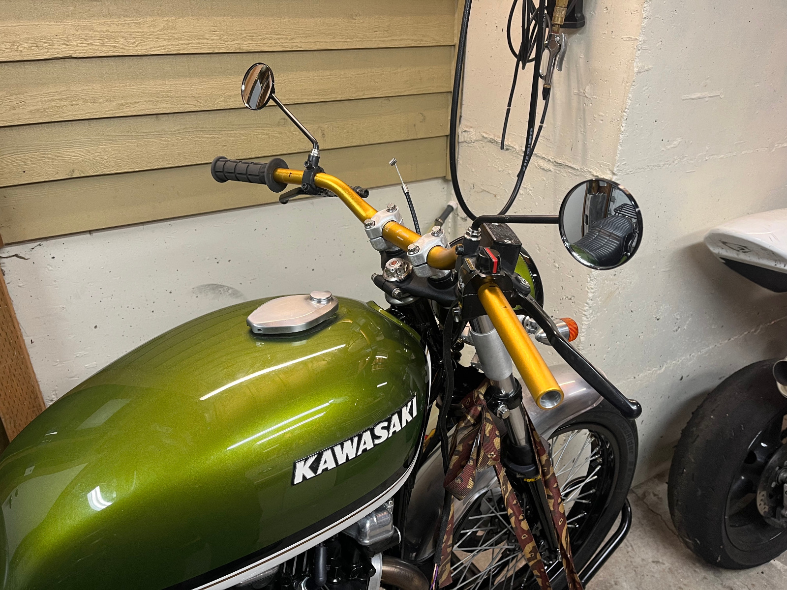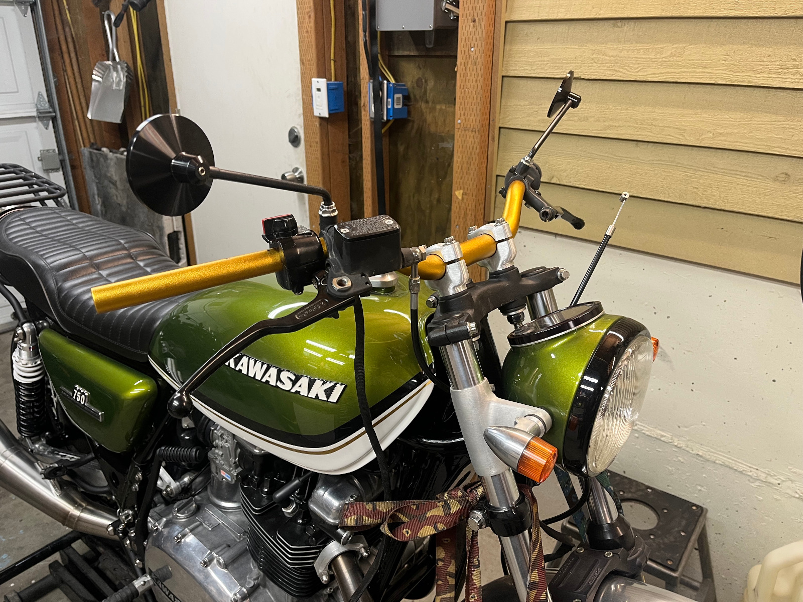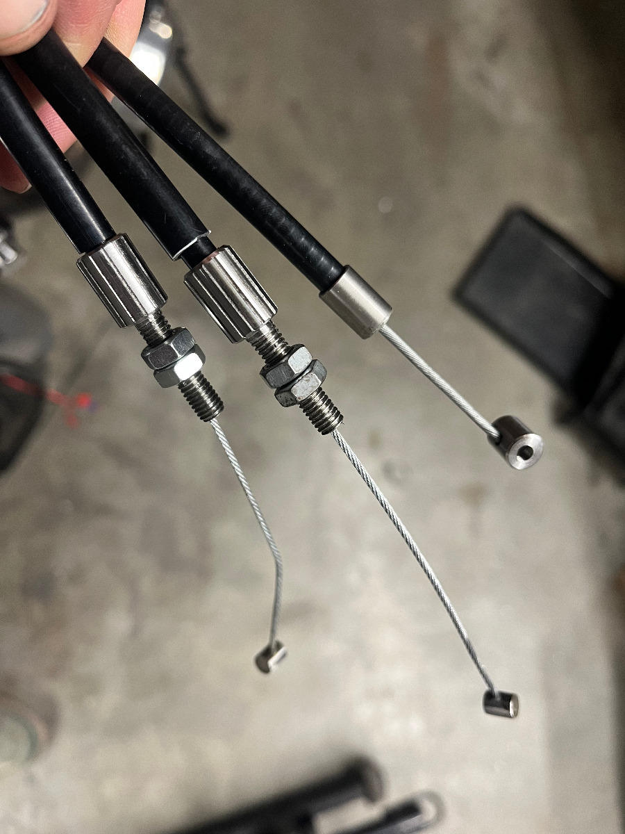 New bars came in and the owner is happy with them. These gold ones were $50 cheaper than black and I was going to paint them anyway to cover up the Rizoma logo. I went ahead and shortened the throttle and clutch cables, machined new ends and ferrules in stainless. Soldered with stainless specific solder and flux and its good to go.