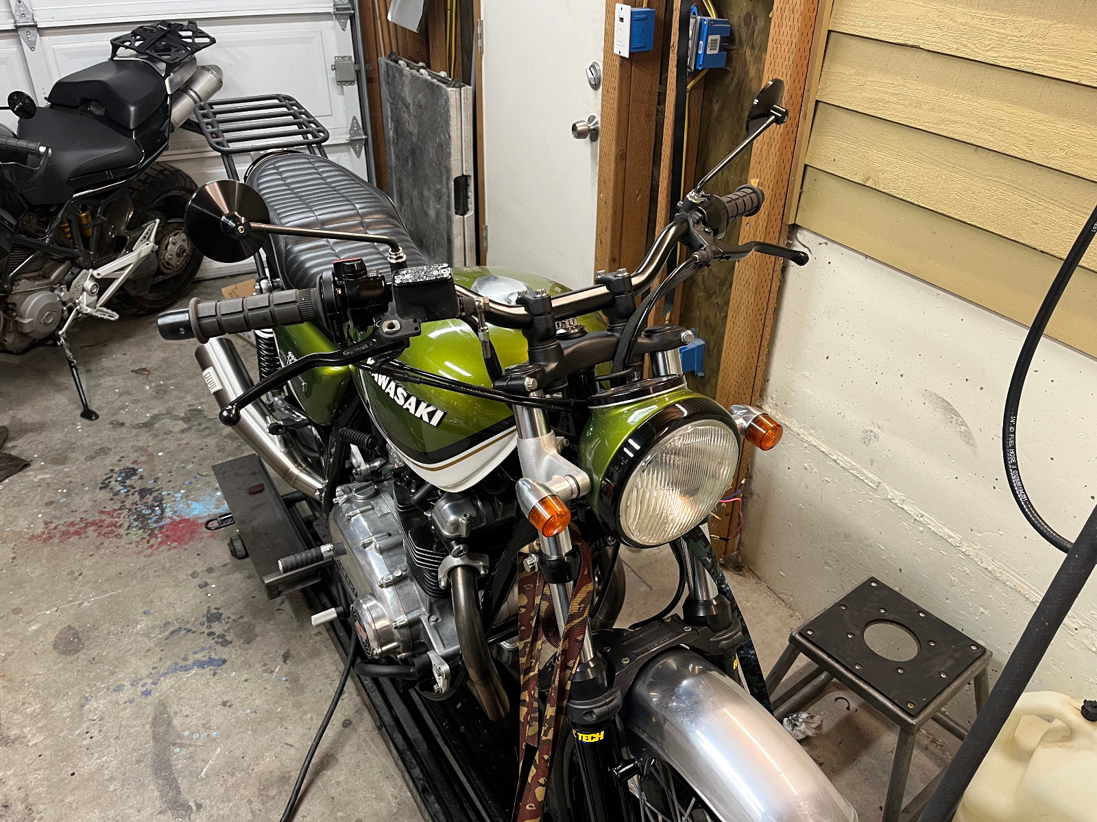 Clamps powder coated and bars painted. Also added some Woodcraft bar end sliders, installed shorter brake hose and fresh brake fluid. These handlebars have a really thick wall so there was no way I was going to be able to internally route the wires even if I wanted to. I put on some fresh woven heat shrink and routed them along the brake/clutch lines. It looks OK, but not my favorite. Just needs an oil change and a shine up and this suckers ready for some better weather.