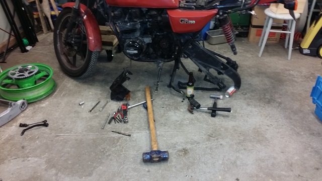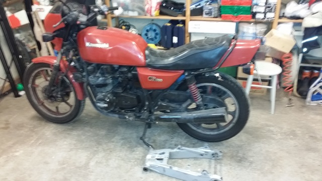 So far I have started to collect good deals for the winter to come. Those beautiful but darn expensive ZRX1100 swing arms will have to wait until I can do a good deal on one. So I settled for a Zephyr 750 Swing arm and picked up a pair of vintage Öhlins piggy back while at it.