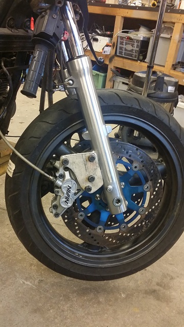 There has been progress this winter and will report on it later. Right now I am trying to fit GSX 1400 Bandit 4 pot Nissin Calipers on a Zephyr 750 fork, running a ZR-7 front wheel with ZXR400L 310mm brake rotors.