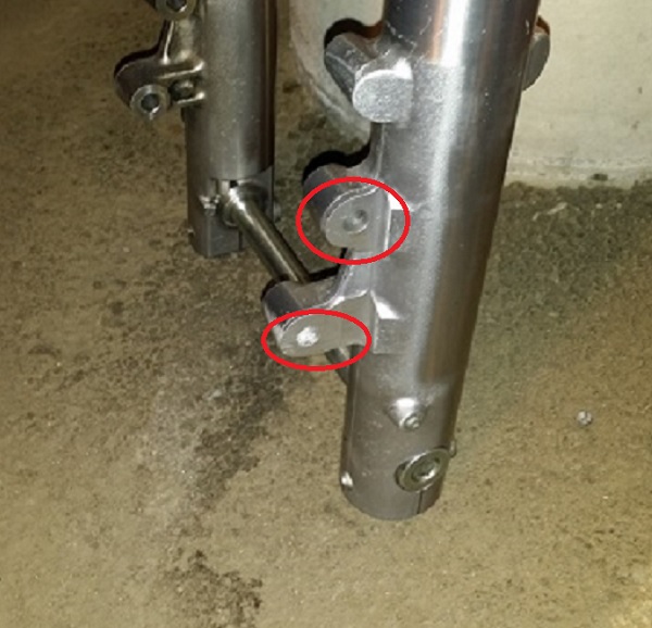 I thought it would be an easy fix to drill out the caliper mounts on the fork legs and Helicoil them in order to fasten my new brackets to the fork legs.
