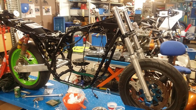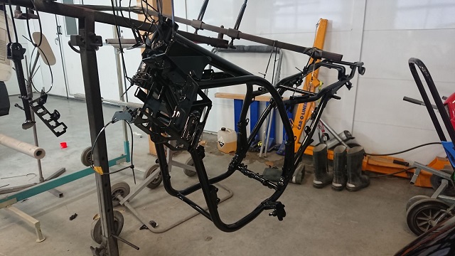 Work continues, the triple tees painted and new steering roller bearings in place the fork goes back on and the wheels goes the same way.