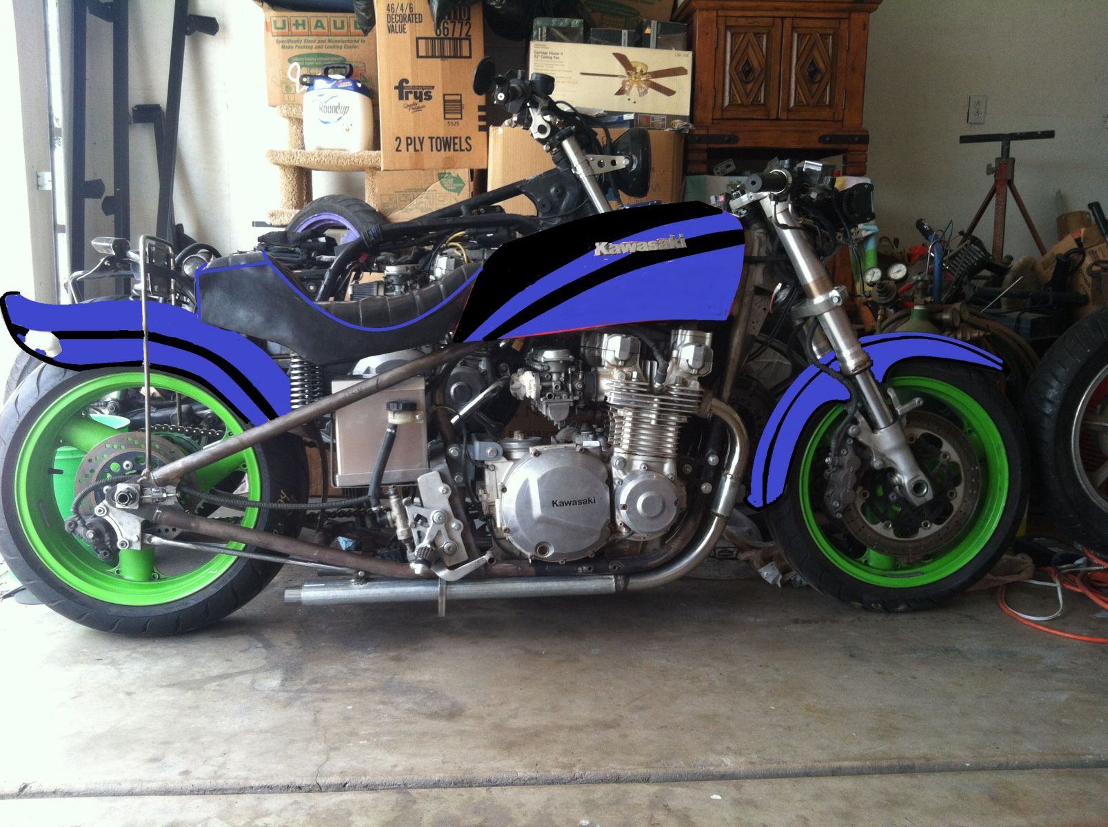 17 Dec 2015 20:09 - 18 Dec 2015 03:44ive been working on this for about 6 months and just wanted to know what people think its a 77 kz frame with a voodoo hard tail 93 zx 750 front shocks and tires not sure of the year but a 7.1 gallon Kawasaki tank and a 93 kz1000p motor